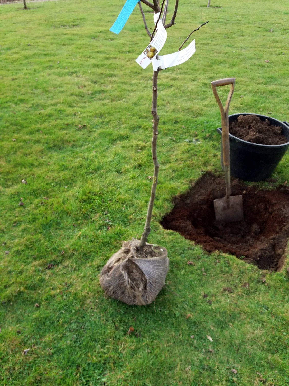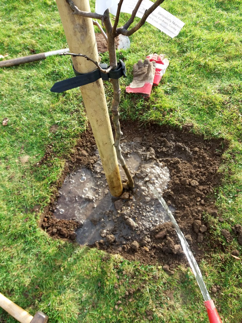 The tree should be watered during dry spells over the period of the next year whenever it has leaves. An occasional soak (half to one bucketful once a week or fortnight) is preferable to little and often as the latter can encourage the tree to make shallow roots rather than deeper roots that go looking for water. In the second year, it should be able to look after itself, though give it a good soak during any very dry spells that may arise, though less so than the first year.