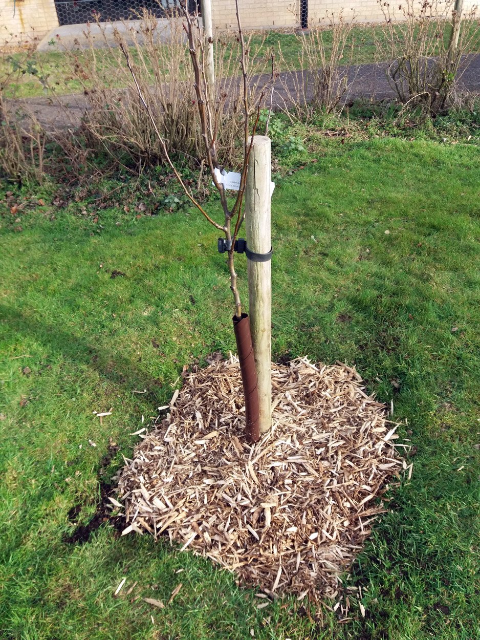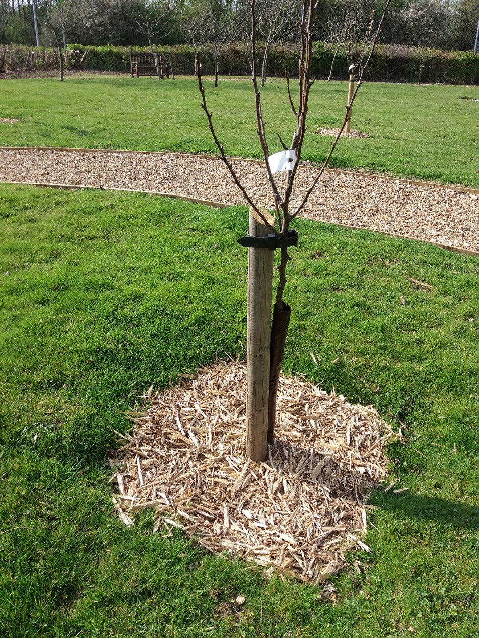The base should be kept free of grass and weeds for at least two years. Using bark chips as here helps suppress weeds and the space around the tree makes mowing easier if it is planted in a lawn.