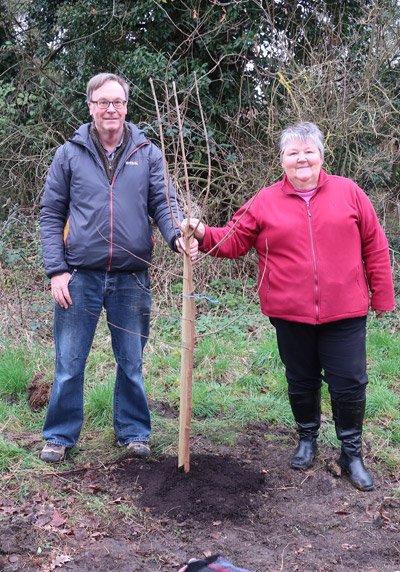 Diane and Graham James with a King James black mulberry tree they donated and planted in the church yard. Mulberry trees can live 1,000 years or more, this one could be around for the next millenial celebration!