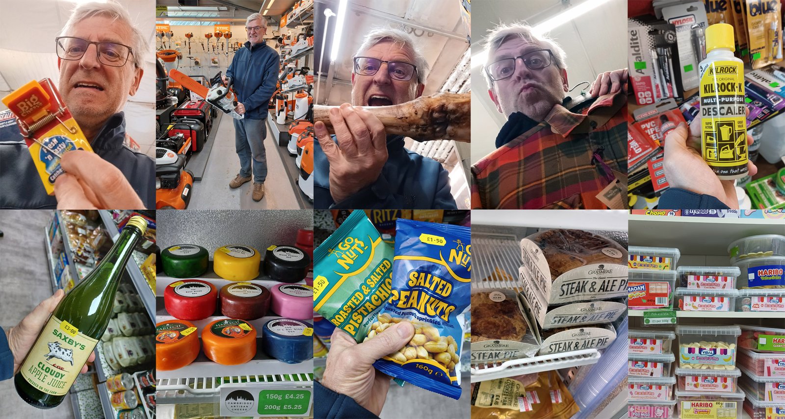 There are two shops in Great Paxton, our village shop and Ibbets, they both sell things that you wouldn't necessarily think of, so I went to see what I could find. Top row Ibbets, bottom row the village shop, clockwise from top left: Mouse traps, take care when handling!, chainsaws (I was told I had to keep the blade guard on), big bones for the dog, cool new threads, descaler - saved me a trip to B&Q.