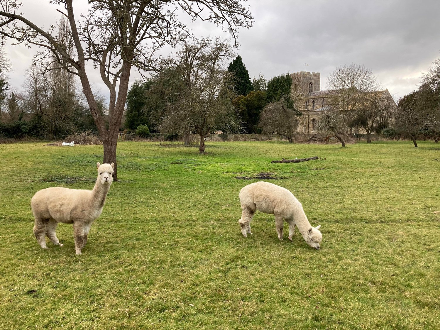 Sonic and Sambuca are 10 year old Great Paxton residents who enjoy eating grass and hanging out in fields. They are shorn annually around May. They came here from Houghton Hall. Here they are seen eagerly awaiting the Christmas Tree Festival that took place in the church behind them.