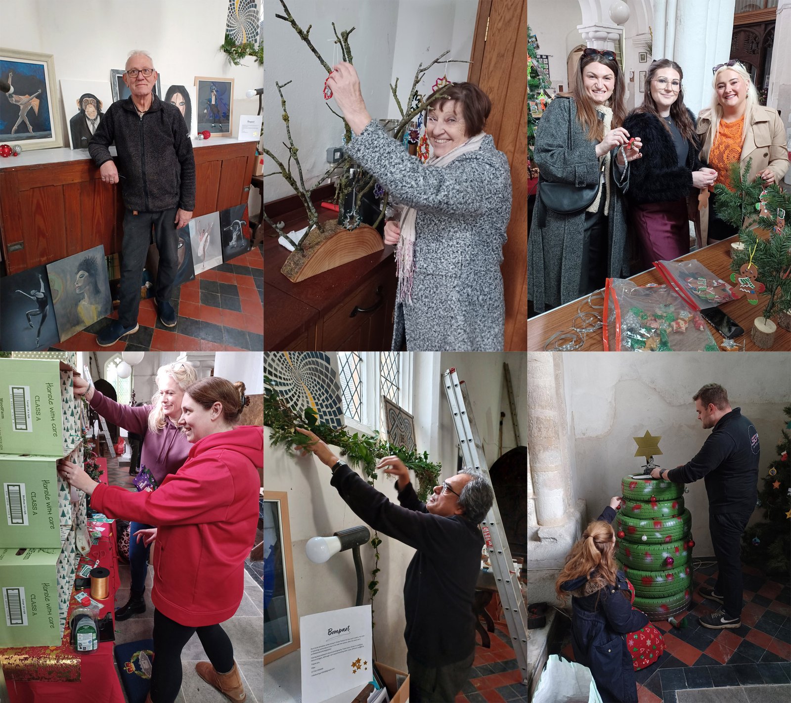 (don't count too carefully!) Some of the people who came along to set up their trees and other displays for the Christmas Tree Festival weekend. Clockwise from top left: Mike Walpole and some of his art, Ann Nicholson with some decorations she has made to raise money for the church, Hannah and friends with decorations made by children at Samuel Pepys school for a dozen small trees along the pews, Steve from SG Autos Ltd and partner setting up their tyre tree, Chris Monaghan and his mosaics, Liane Moyser and Joanna Clark setting up the village shop tree. Apologies for not knowing everyone's names.