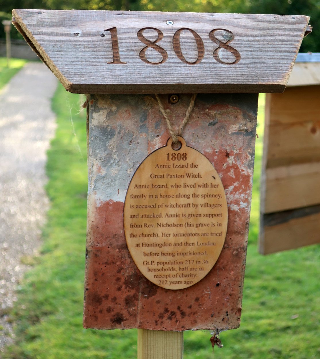 Annie Izzard, who lived with her family in a house along the spinney, is accused of witchcraft by villagers and attacked. Annie is given support from the Rev. Nicholson (his grave is in the church). Her tormentors are tried first at Huntingdon and then in London at the highest court in England before being imprisoned.