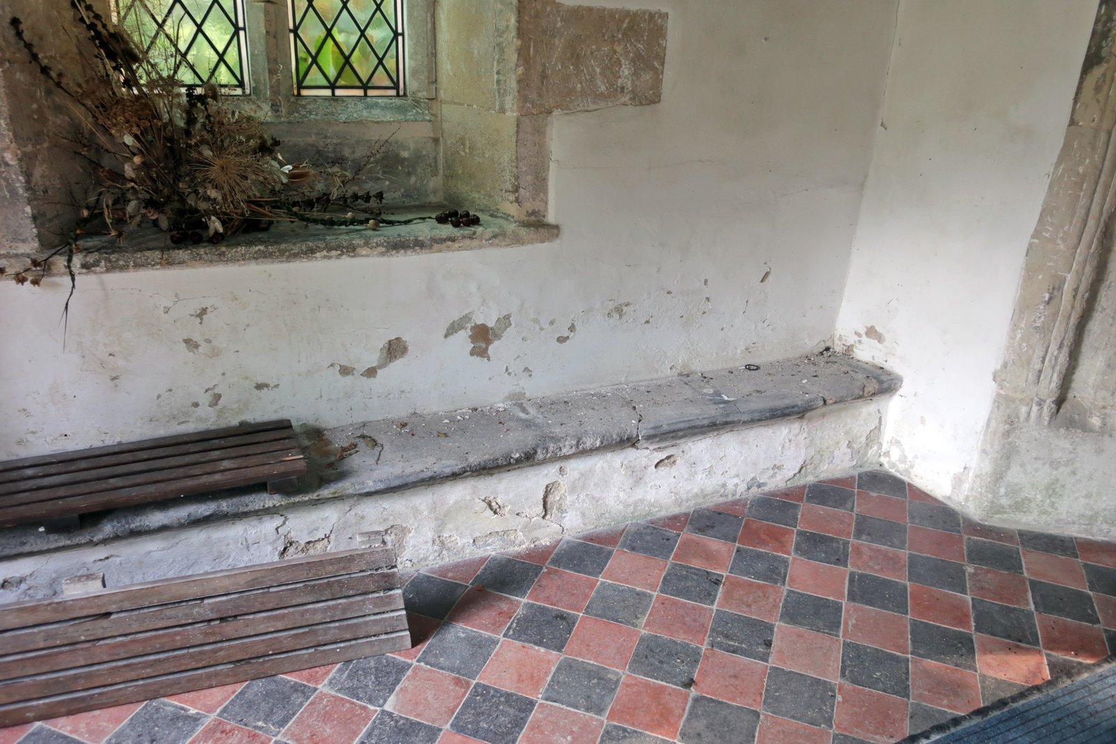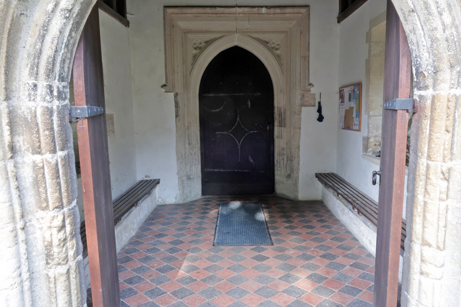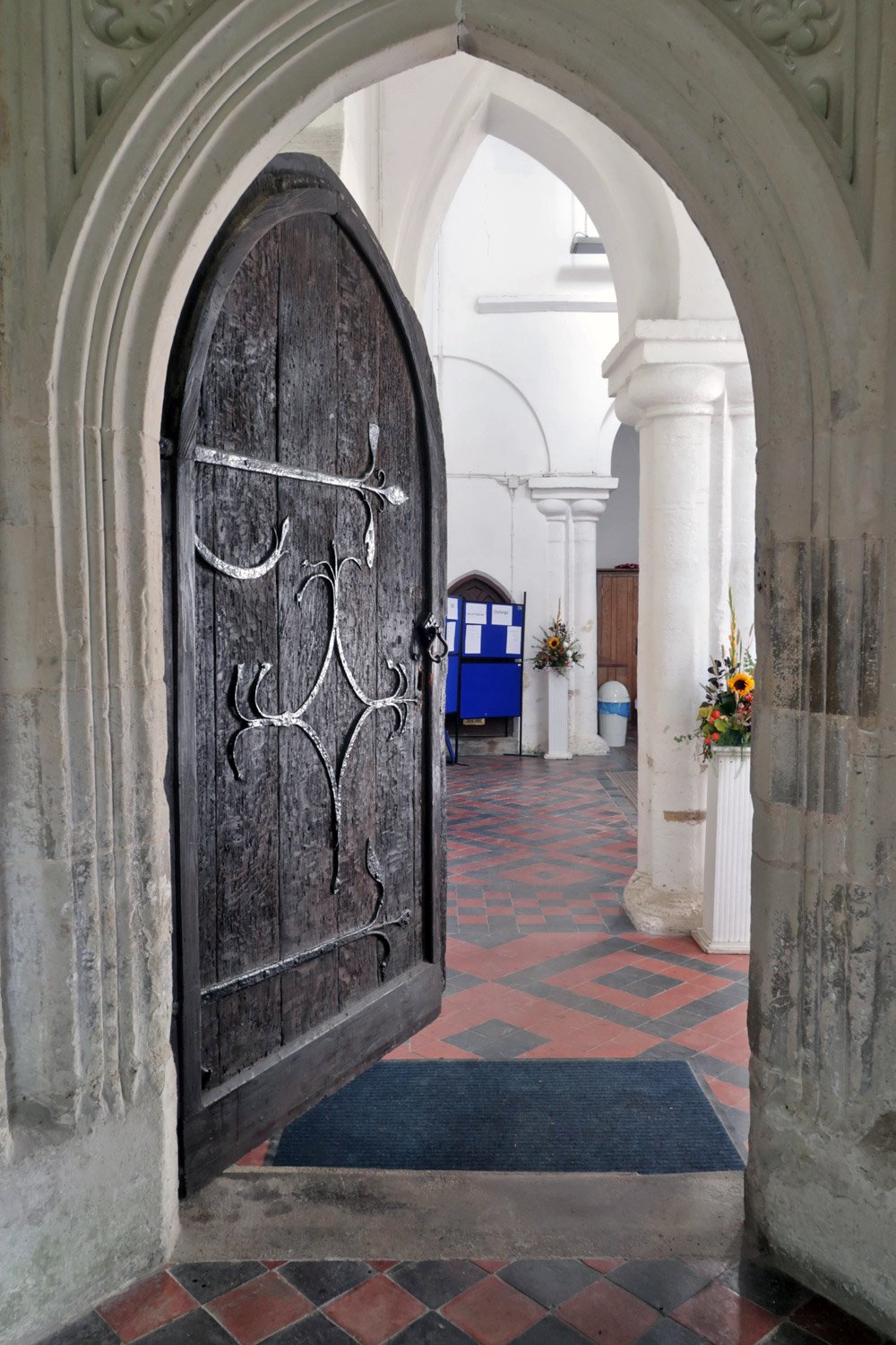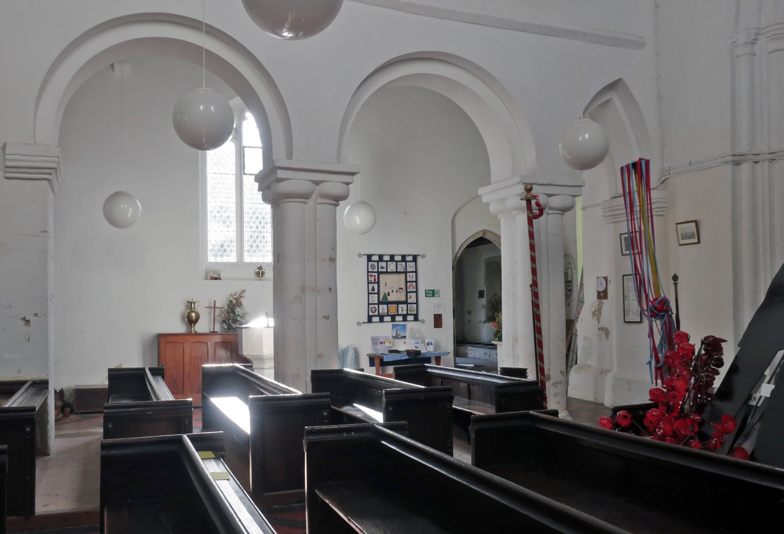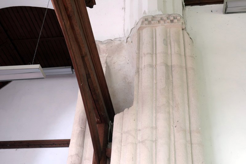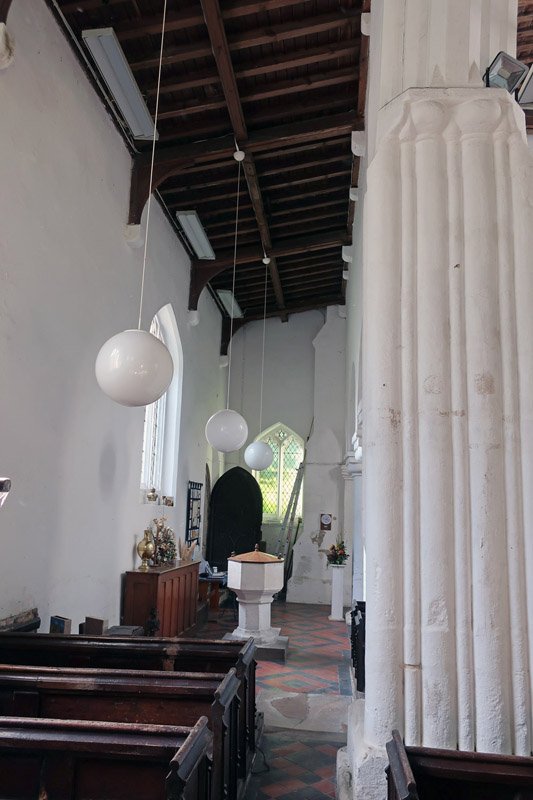 Standing in the nave looking back out the door. The pillar is a part of the original from 1020, likewise the rounded arch to the left. The asymmetrical pointed arch is a somewhat clumsily executed adjustment probably dating from about 1380 when the tower (to the right) was added with the result that the nave was shortened. Originally this third arch would have been complete and there would most probably have been a further fourth arch to right and perhaps even a fifth after that. The south aisle is between the pillar and the door.