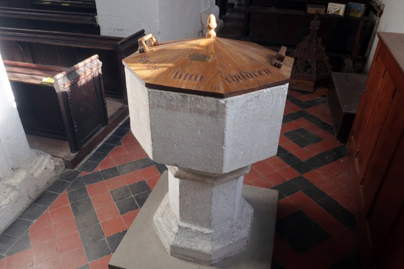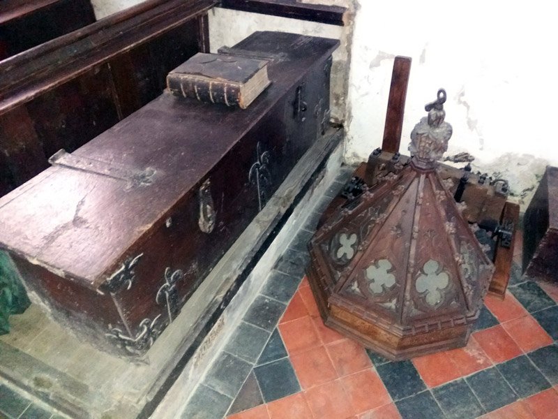 This older much larger, heavier and more ornate font cover lies on the floor just behind the font. It was given in memory of Clara Towgood in 1897 and was suspended over the font from the roof by a rope, being raised and lowered by a pulley until it became unsafe in 2014. To the left is the church chest dating from the 1400's.