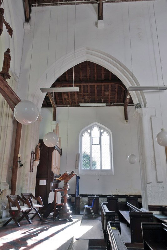 The northern arcade, the third arch to the left has been filled in, though the outline can be seen. The clerestory windows above line up with the arches, light from those on the southern side can be seen falling on the wall. These windows add considerably to the amount of light in the church and especially the higher part of the nave, it must have been notably darker when these were blocked up as they were in the past.