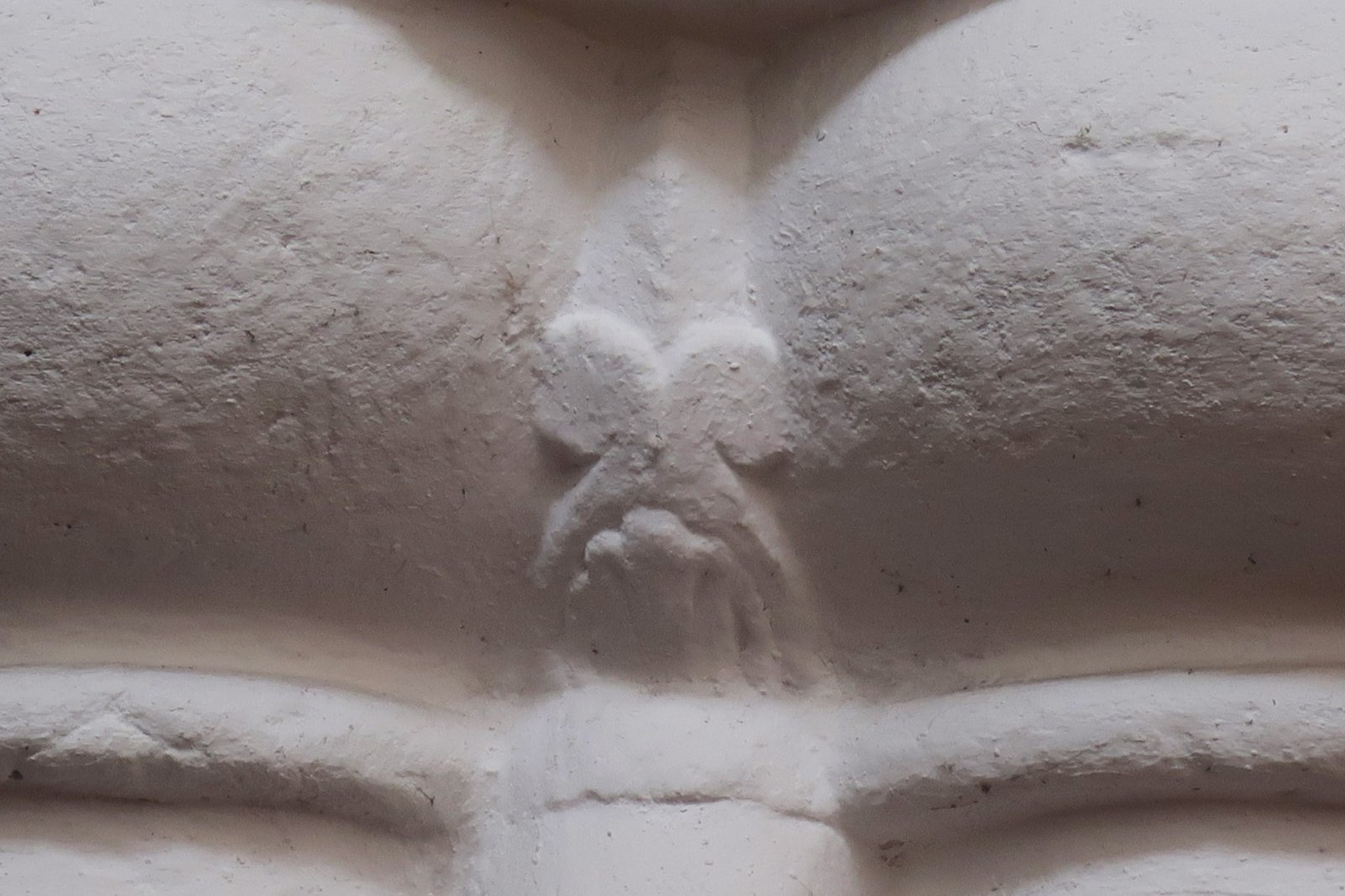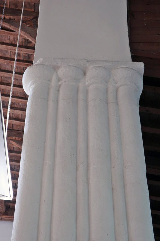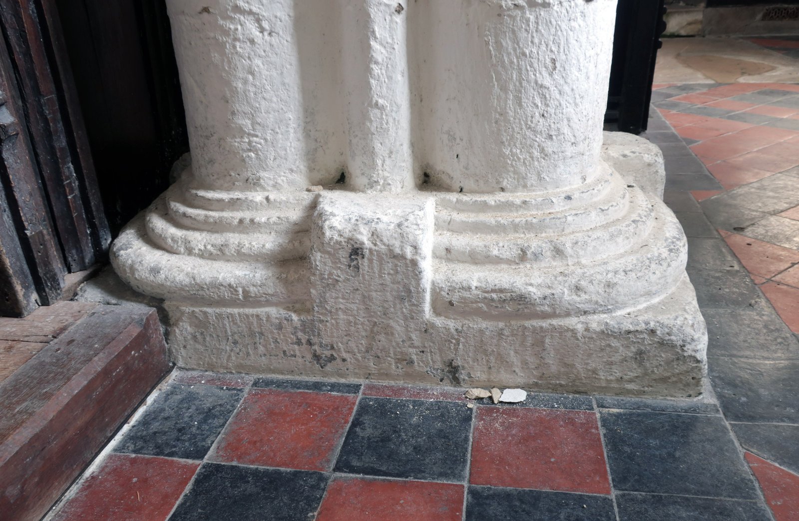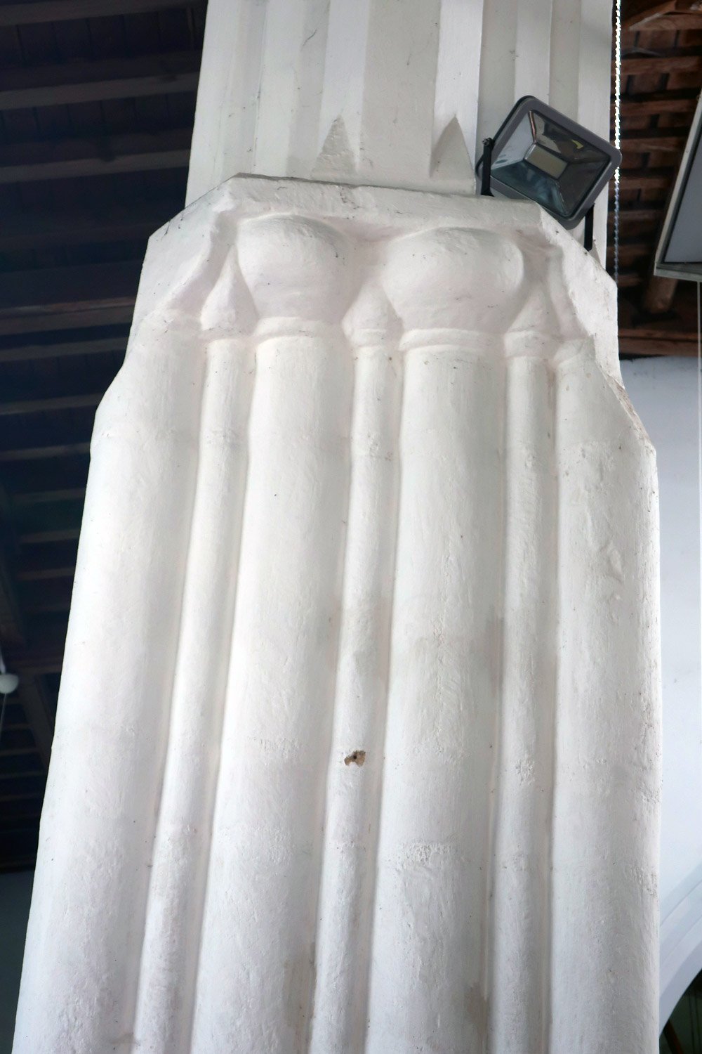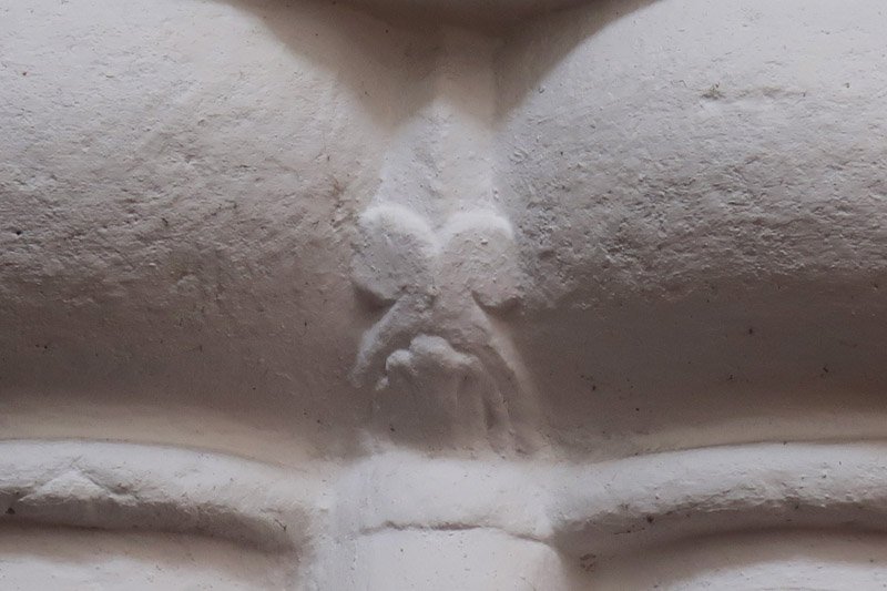The base of the second Saxon pillar you encounter on entering the church. While the triangular strip is present, at the base it ends in a simple unfinished bulge of stone. Did the stonemasons forget to finish these in the same manner that they did the first columns? Did they get paid to do them but got away without doing so or was it an example of cost-cutting and hoping no-one would notice after the first?