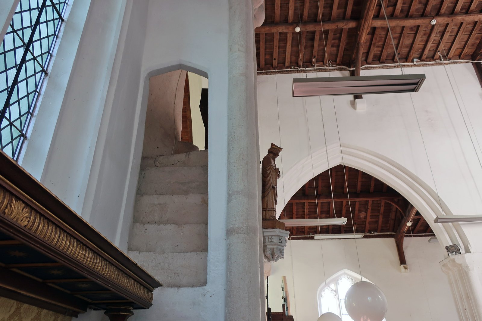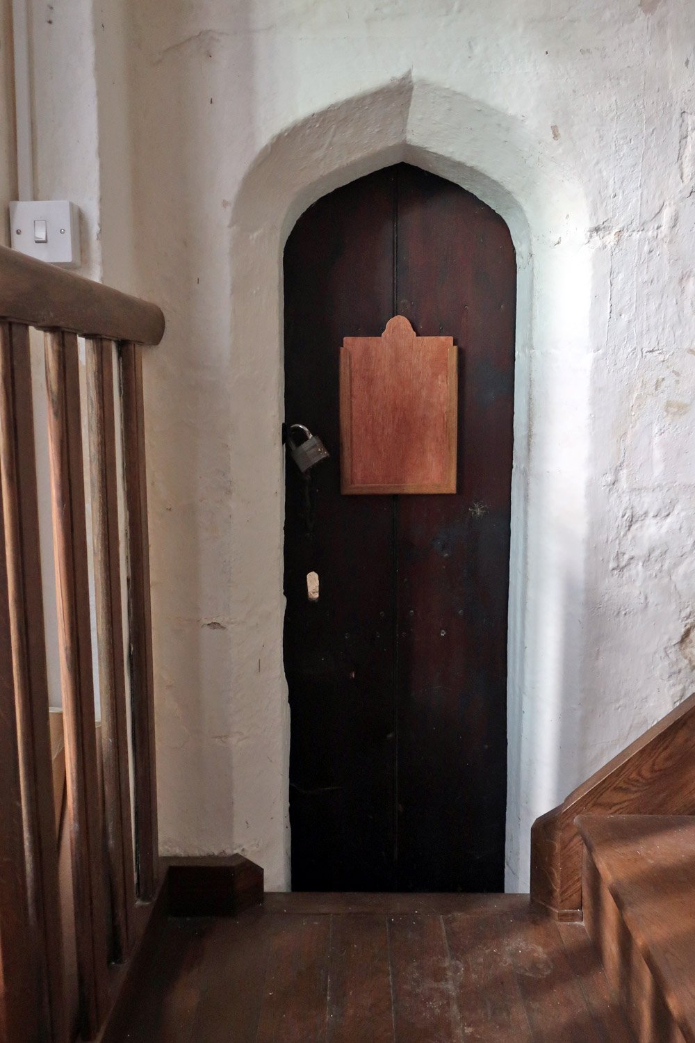 It led to a rood loft, a gallery, or platform, atop the rood screen, used for the rood (crucifix) and sometimes for musicians or singers. It would have been more substantial than the current screen, probably 3-4 feet wide, enough for a single file row of people. It was probably destroyed at any time from the Reformation in the early 1500's to the civil war in the middle 1600's. Access to the first step would have been by a short ladder.