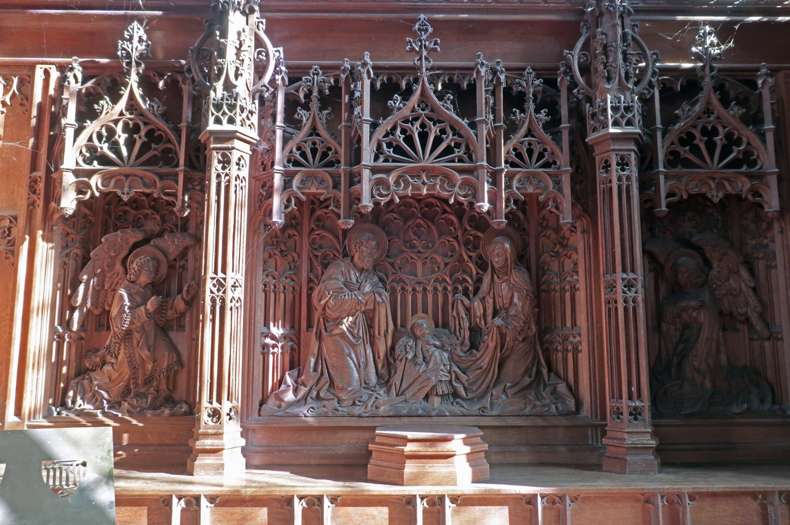 A fine wooden carving known as a reredos at the chancel altar, paid for by Hamer Towgood in 1899 in memory of his three sisters. Some of the Towgood family lived at Paxton Hill House having made their money from the Little Paxton paper mill in the 1800's. The Towgoods were great benefactors to Great Paxton and the church, several are buried in the church yard.
