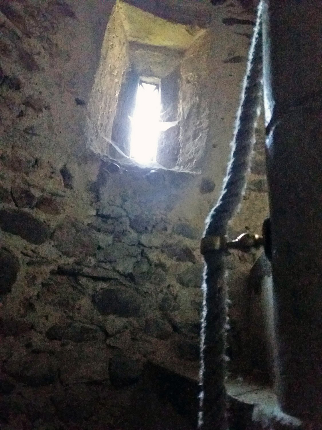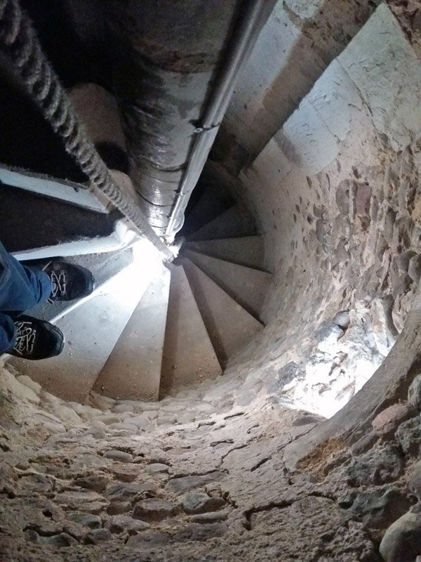 At the top of the staircase looking downwards. There are now electric lights along the way, but relying on the small original windows is so much more atmospheric and is exactly as it would have been at any time back to 1380. As with all steep staircases, spiral or otherwise, going up is harder work but feels much safer than going down.
