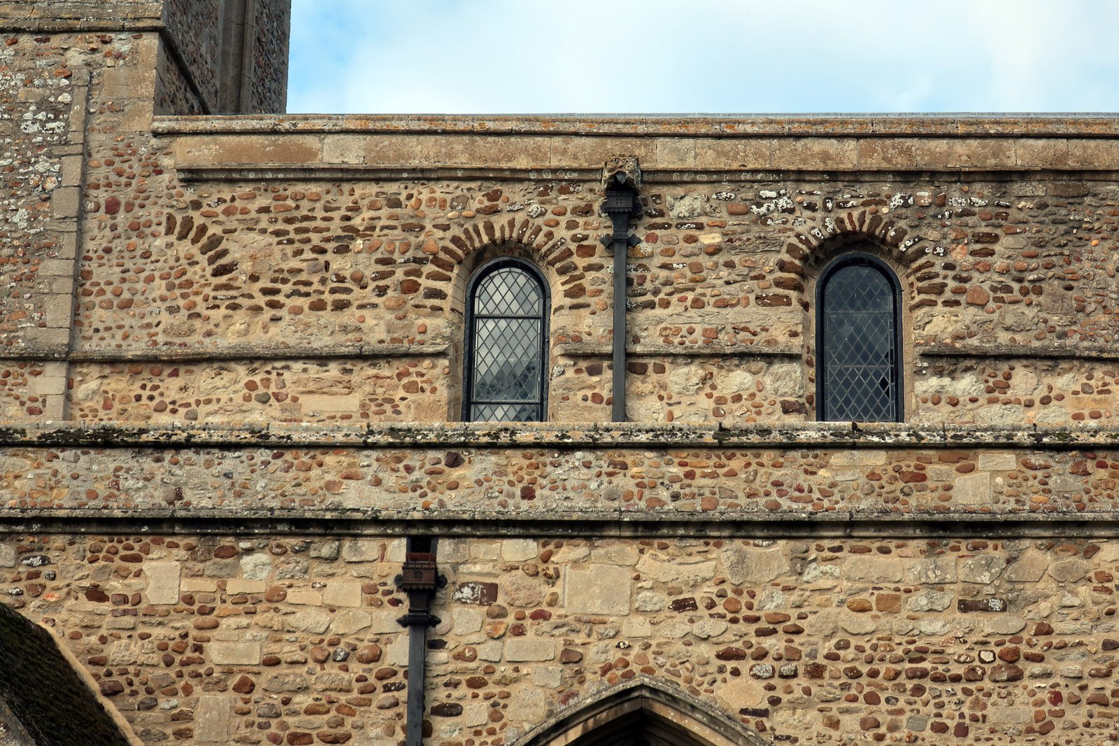 The south face of the church. The lower level is the aisle and dates from the late 1400's, above this is the "clerestory", with windows (unusually large for such an early date) to admit light, this is part of the original Saxon minster dating from 1020. To the left can be seen a third window cut in half when the tower was built in about 1380. The clerestory windows match up with the internal aisle arches below them, it is thought that there were originally 4 or perhaps even 5 aisle arches and therefore perhaps the same number of clerestory windows. These windows were blocked up at some time in the past, possibly a response to damage and a lack of funds at the time to repair them properly. They were re-instated as windows again during a major renovation that began in 1867.
