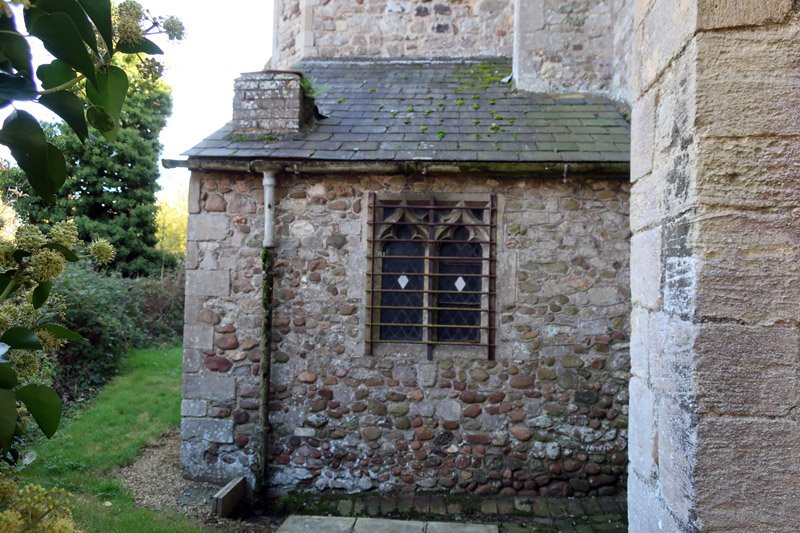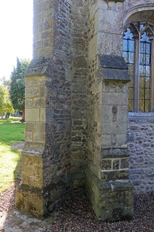 The north-east corner of the chancel - buttresses to the walls. Unusually these are doubled up with one at 45 degrees and one next to it at 90 degrees. The angled one coming off the corner was added around 1500, with the other added around 1520 after a settlement, they were added to help support the walls along with other buttresses around the church, also around 1500.
