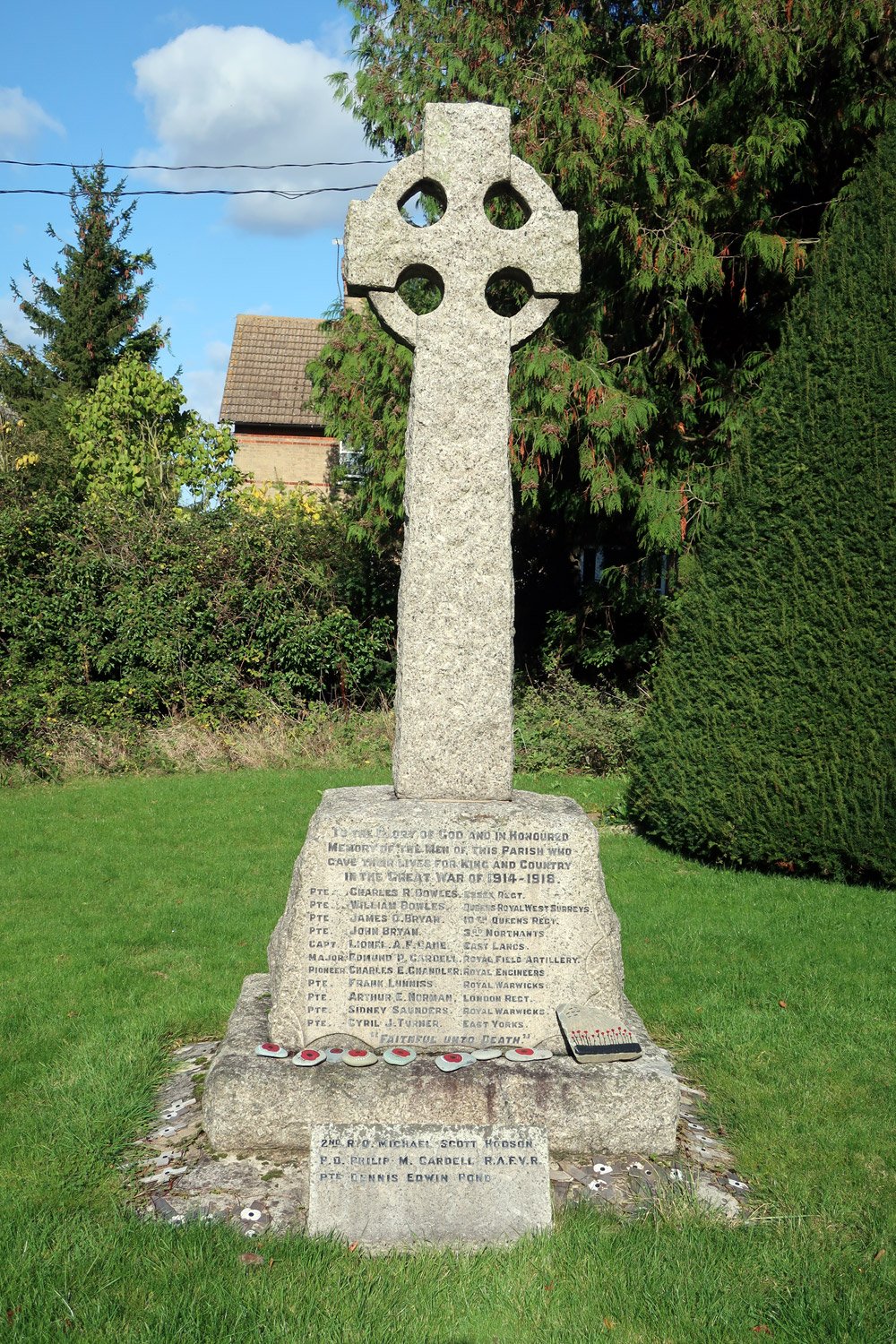 The war memorial in the church grounds. It was erected to commemorate the 11 men who fell in the First World War from Great Paxton, later 3 further names were added from the Second World War. More about the memorial