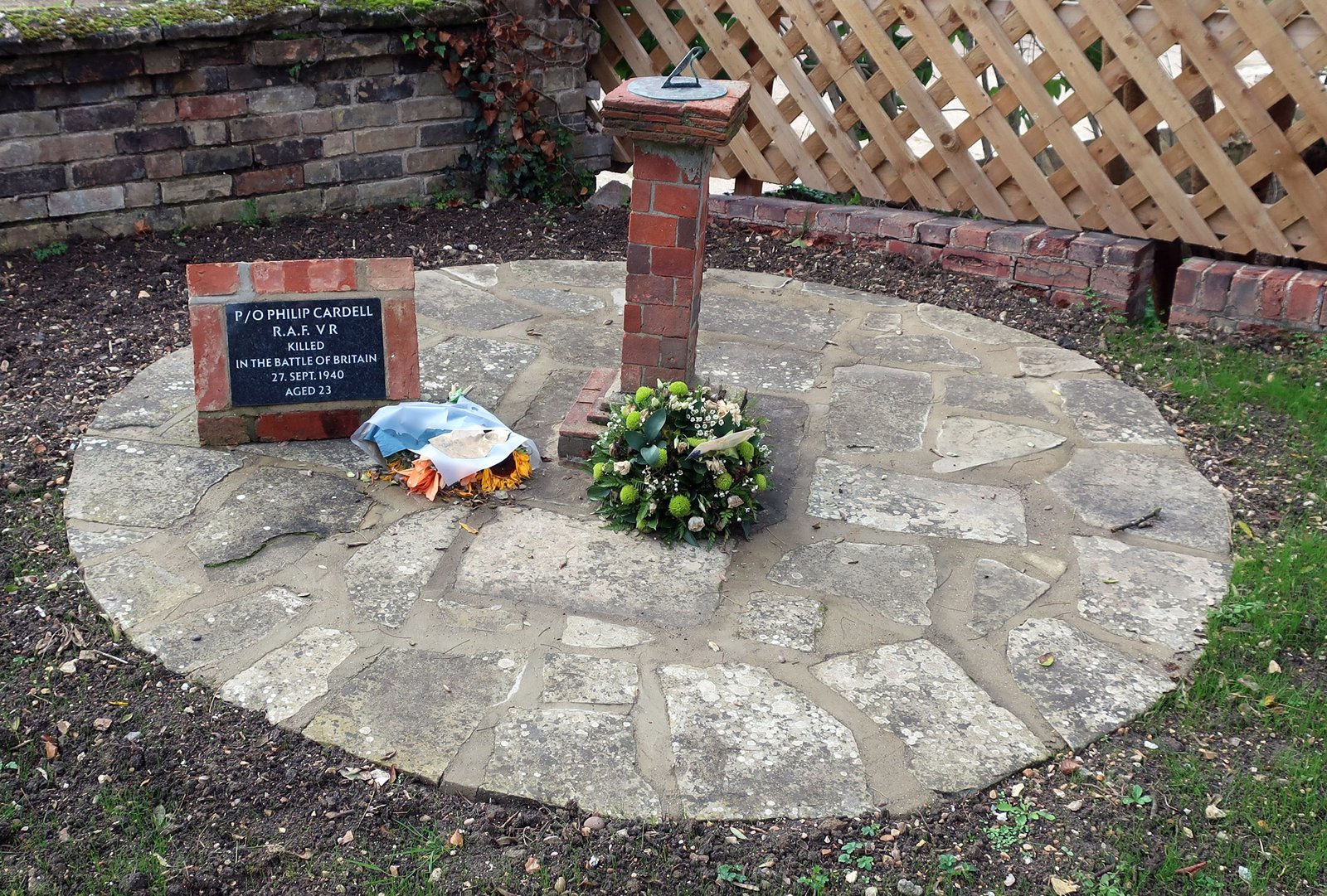 The grave of Philip Cardell in the corner of the churchyard. Killed at the age of 23 during the Battle of Britain, Cardell was one "The Few". He lived with his family at Manor Farm which is next to the church just over the fence behind the memorial here. As a farmer he would not have been called up though volunteered to serve. The somewhat unusual sundial memorial was made by Philip Cardell himself about a week before his death while home on leave as an ornament for the family farm.