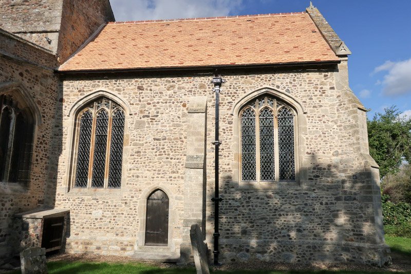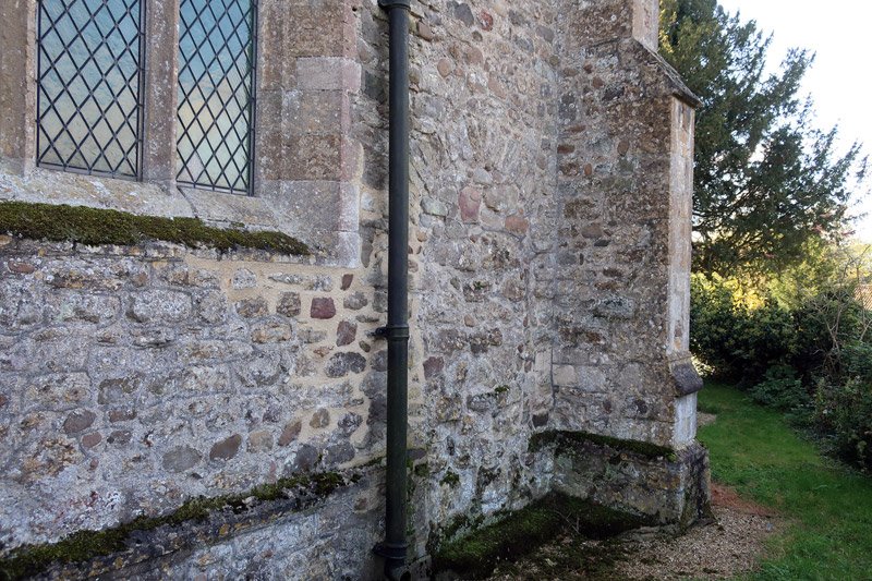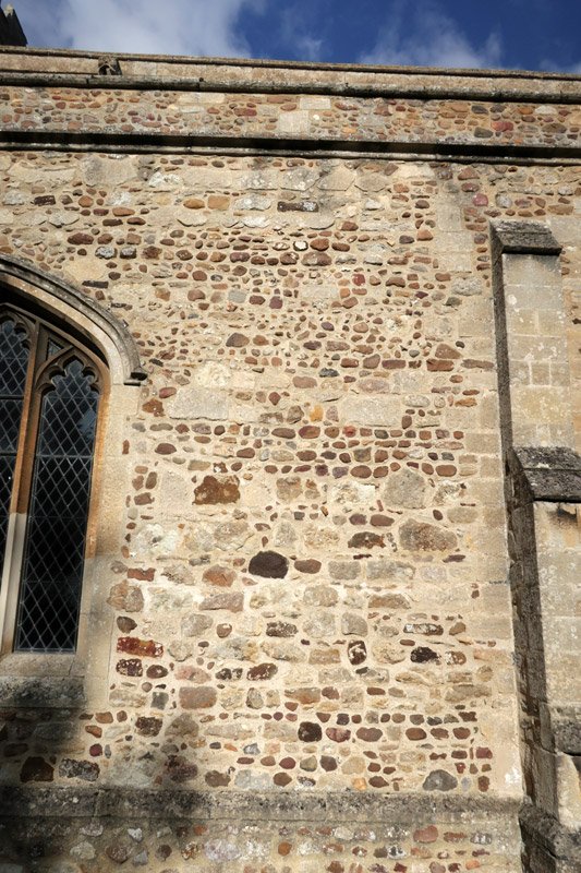 The outer wall of the southern aisle. The church is made largely of locally found stones from the fields in the absence of any good local building stone, they are held together with lime mortar. This kind of construction was slow and stones are found in similar groups probably according to what turned up at the time from some particular source. Of particular interest are the larger dressed stones that occur higher up the wall that may come from derelict stone buildings in the area probably brought by river-borne medieval building reclamation merchants, the stones original use may have been in Roman times.
