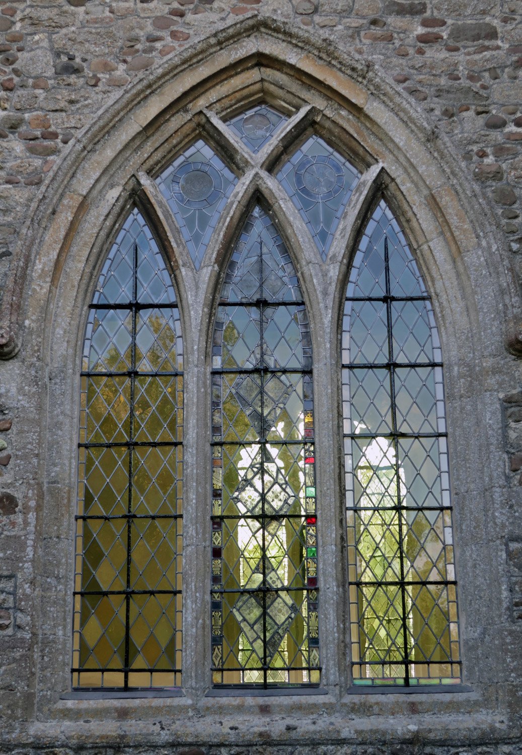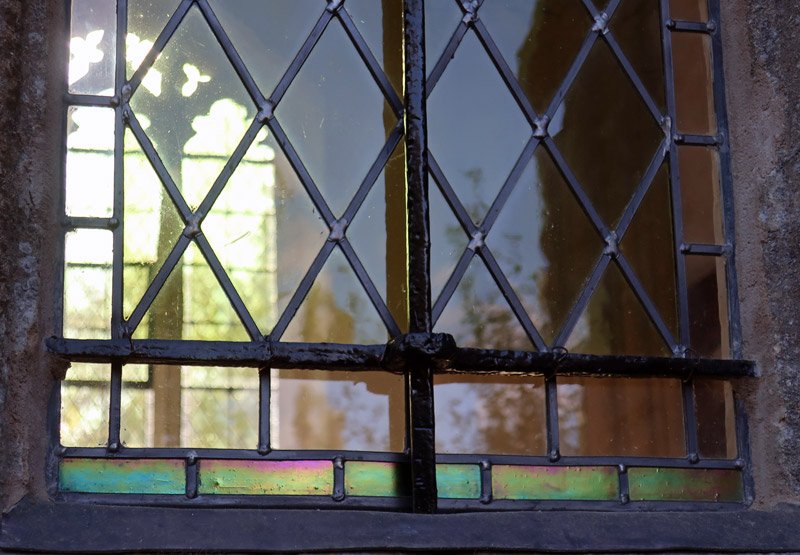 A window in the north aisle - the small pieces of stained glass are remnants salvaged from what were probably full stained glass windows destroyed either during the 1500's with the dissolution of the monastries by Henry the VIII from 1536 and with further damage in the reign of Edward VI (1547-1553) or possibly at the time of Oliver Cromwell in the 1640's. They would likely have been kept safe somewhere until it was permissable again to include them in the window.