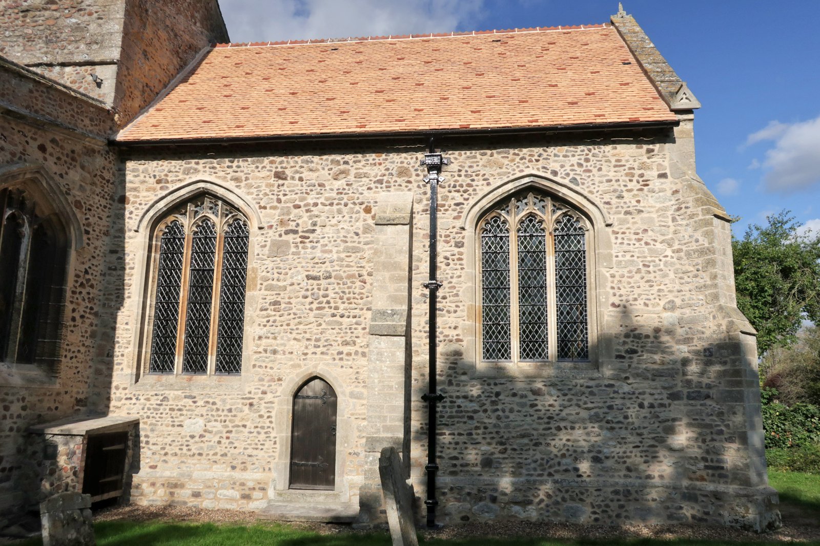 The chancel at the eastern end of the church - a priests door used to allow clergy to enter the chancel without walking the length of the church. During the 1867 renovations, the base of a buttress was found near this door probably belonging to the original Saxon chancel. This chancel was rebuilt to replace the original around 1200 when it either partly collapsed or became unstable. The original may have been apsidal, with a semi-circular end at the right as this was typical of such churches during the period it was originally built. The roof tiles were replaced in 2019.