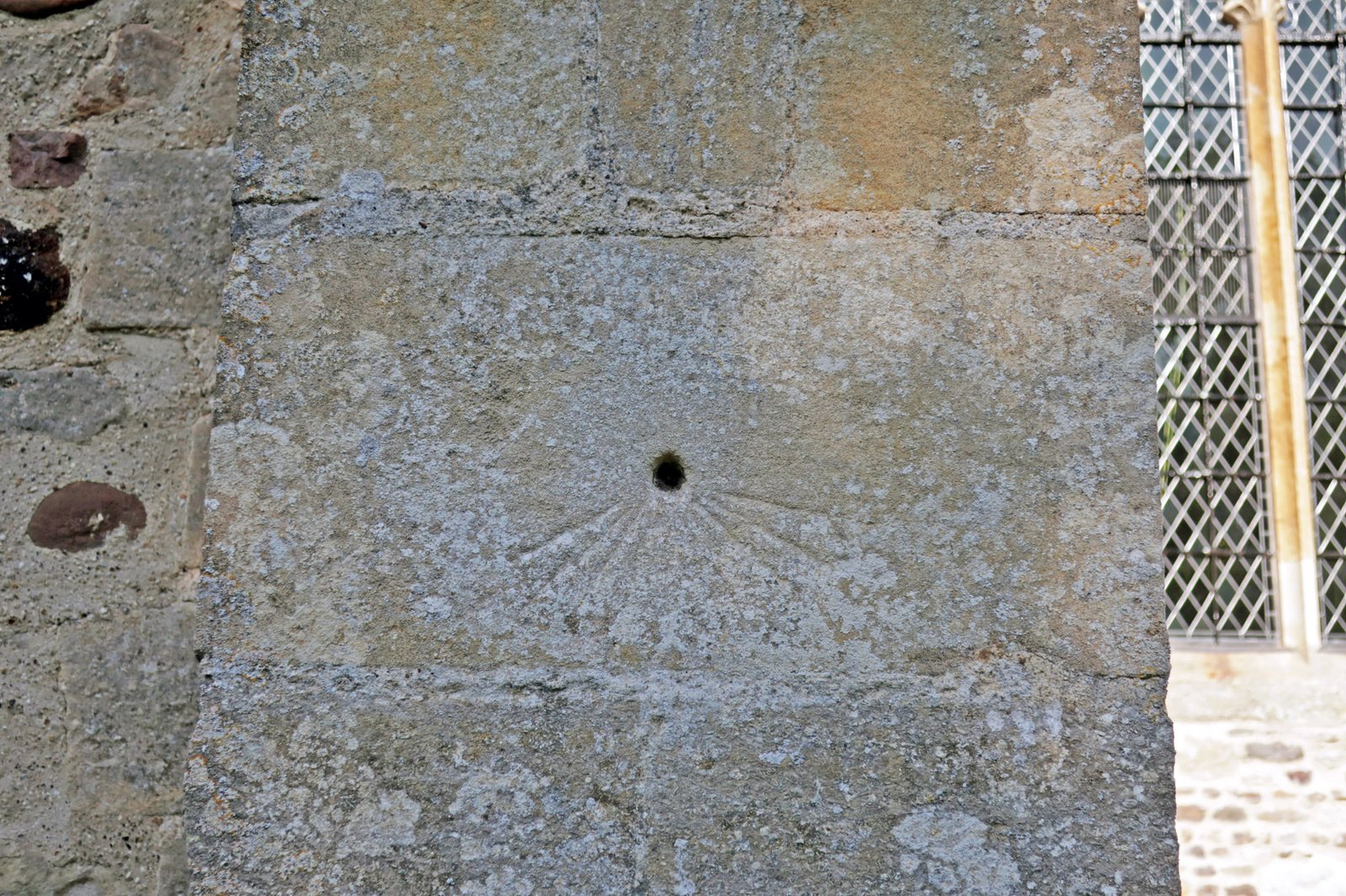 A sundial on a buttress at the eastern end of the southern aisle. The aisle was built in the late 1400's, with the buttresses being added about 1500. More specifically this is a "Mass Dial", a scratch sundial placed on the south wall of a church as an event marker for daily church services rather than an actual time piece. Due to the long lost gnomon (the bit that casts the shadow which would have been placed in the hole) being horizontal it would not have recorded the same time through the year as the sun moved across the seasons, but the time proportionally through the day.