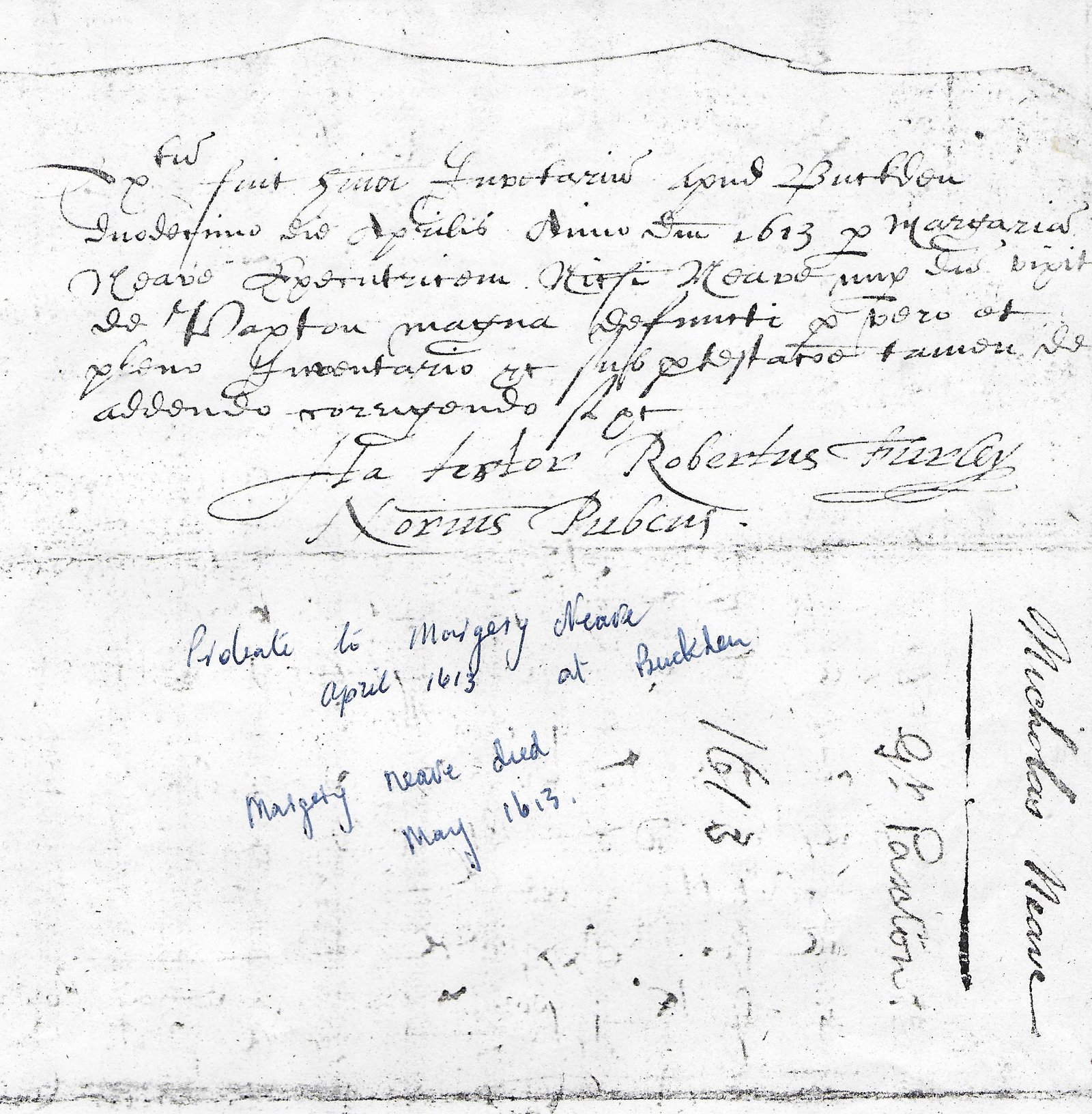 Ex[hibi]tu[m] fuit hui[usm]o[d]i Inve[n]tariu[m] apud Buckden Duodecimo die Aprilis Anno D[omi]ni 1613 pro Margaria[] Neave Executricem Nic[holau]si Neave nup[er] de vixit de Paxton magna Defuncti pro vero et pleno Inventario et sub p[ro]testat[ion]e tamen de addendo corrigendo si etc.