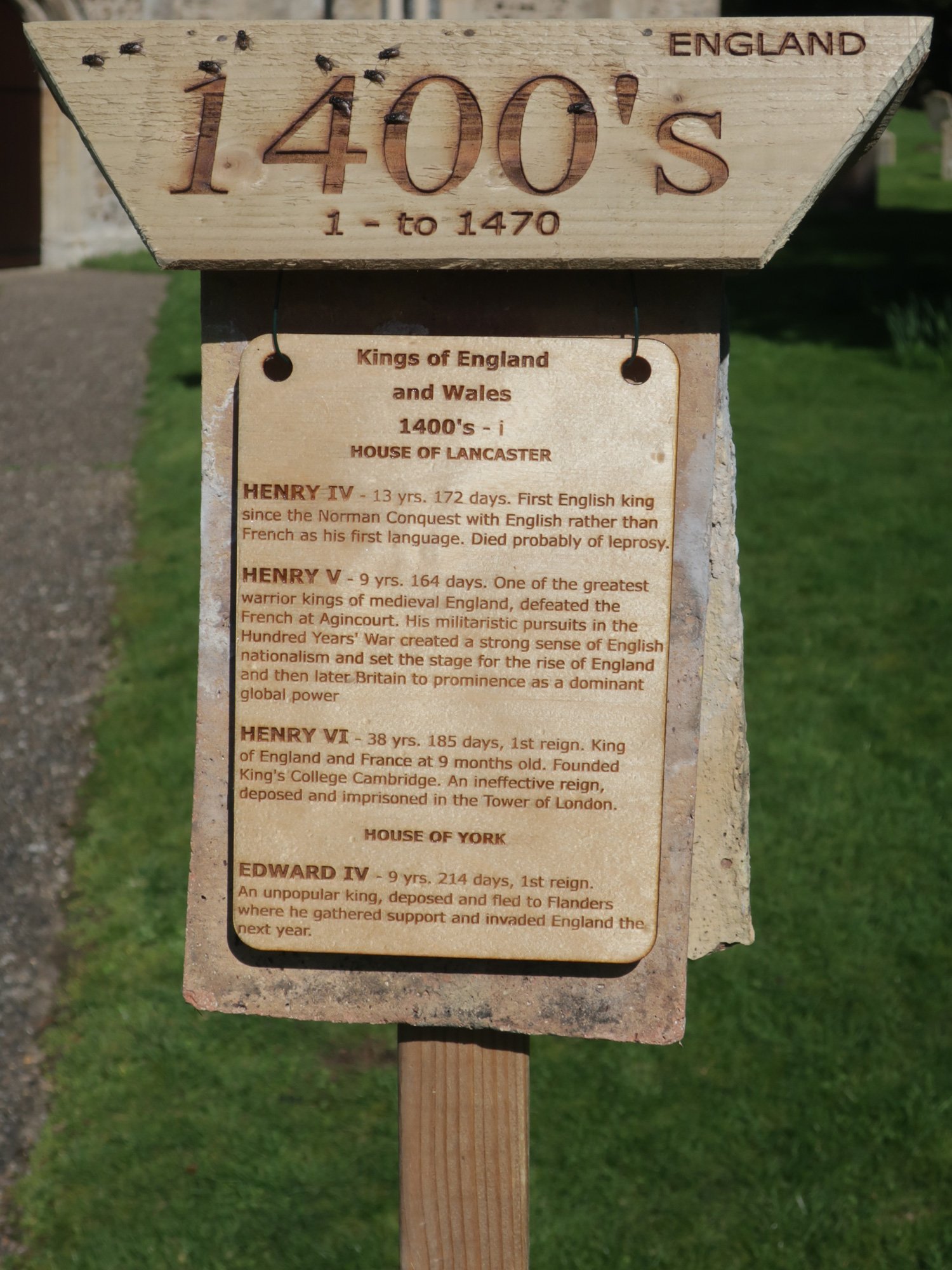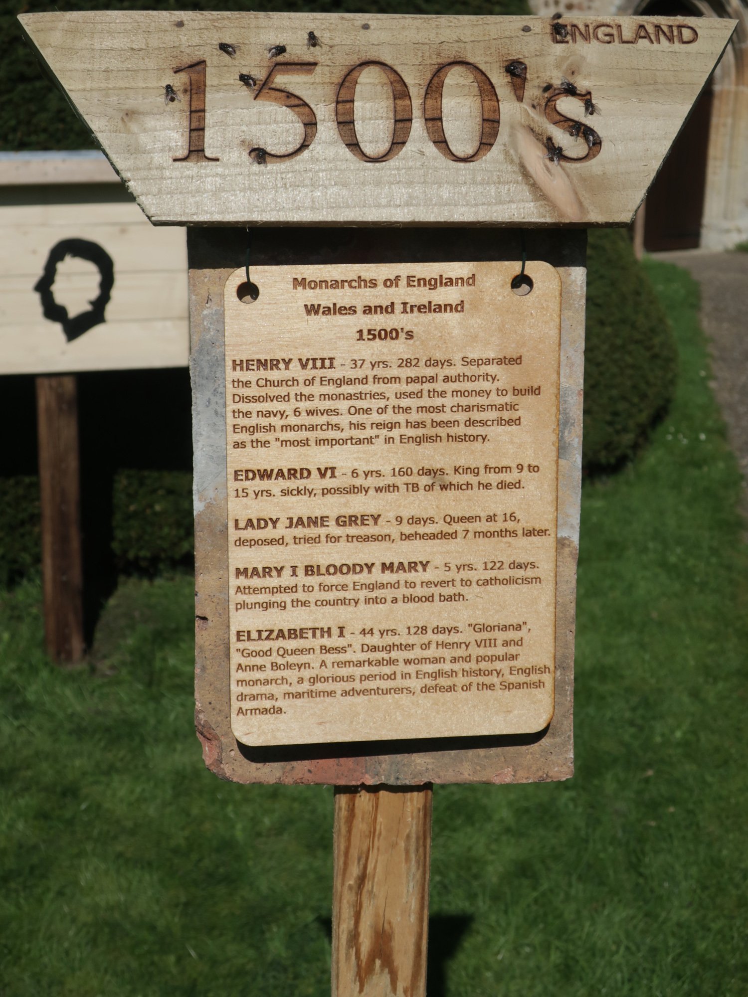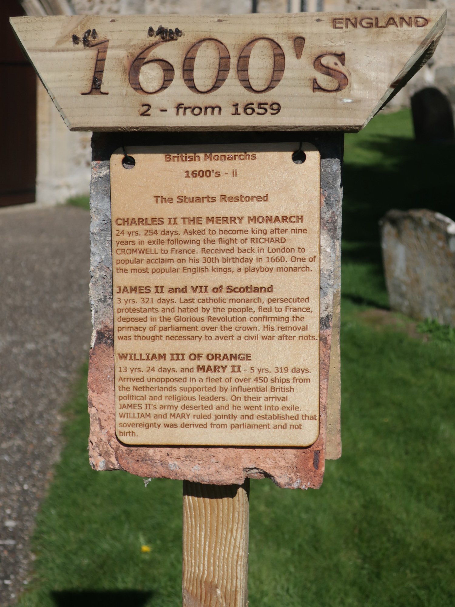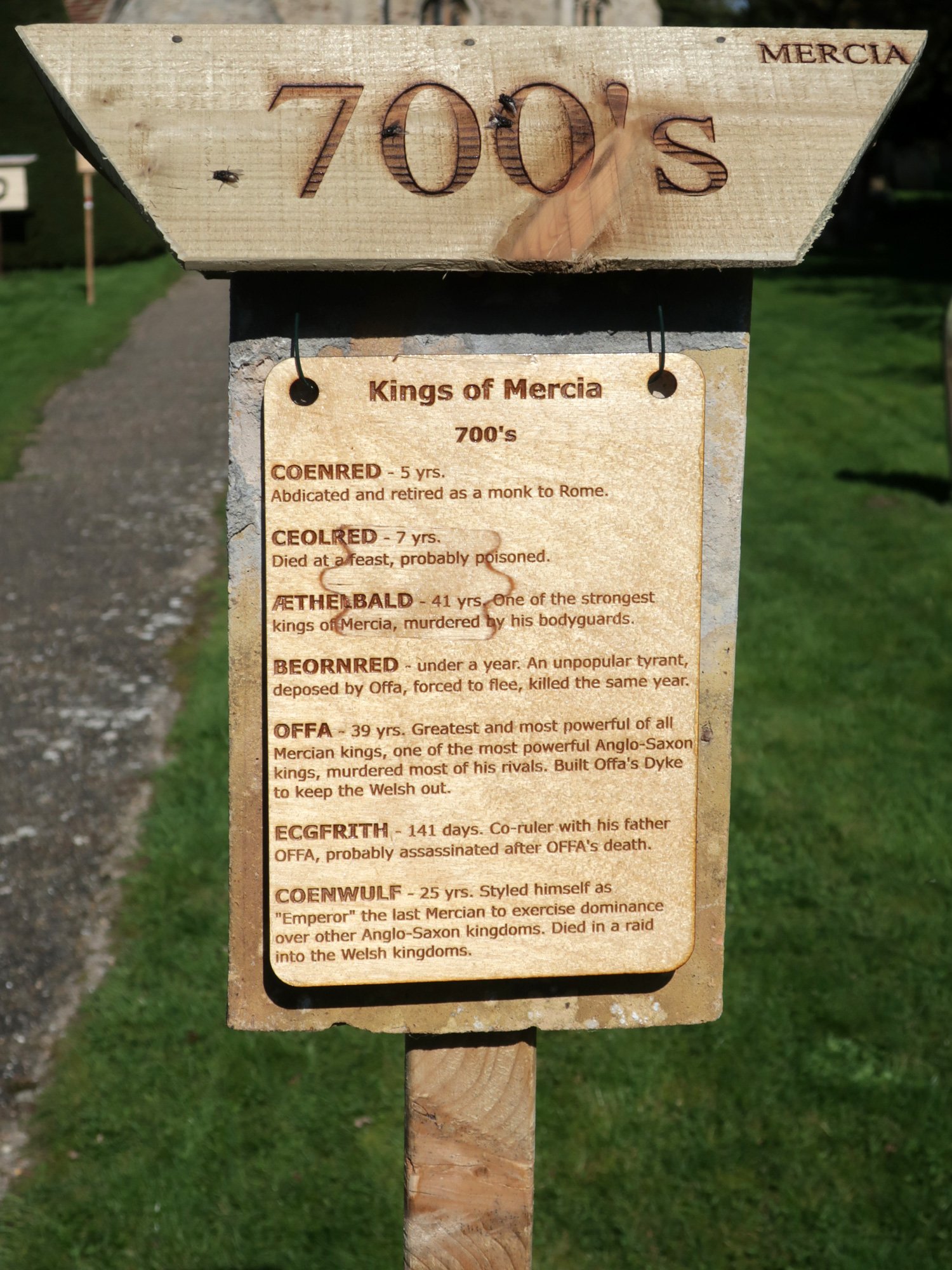 Each post is hung with two tiles as a background that came from the chancel roof during a 2019 restoration. The coloured stripes on the post represent the colours of the national flag at the time, yellow and blue for Mercia, red and white for England, red, white and blue for the United Kingdom.