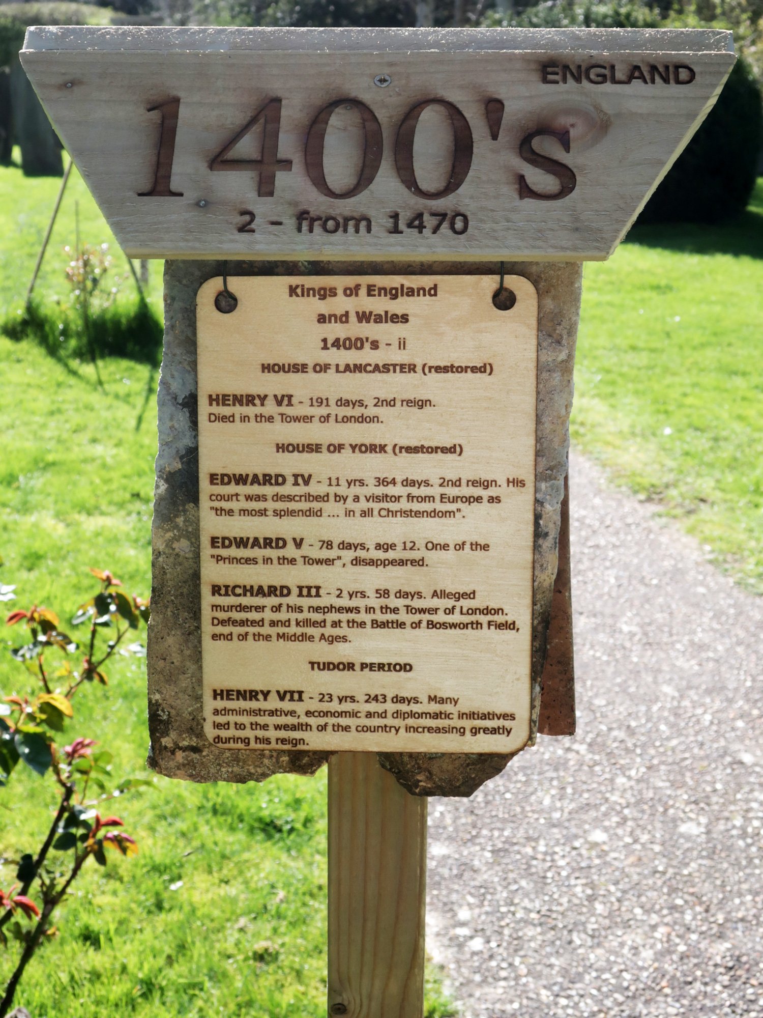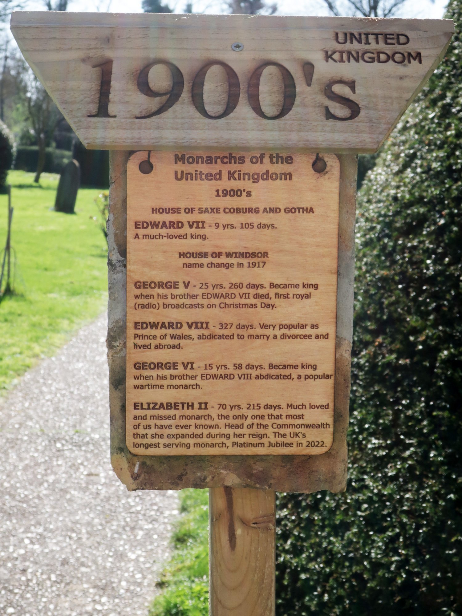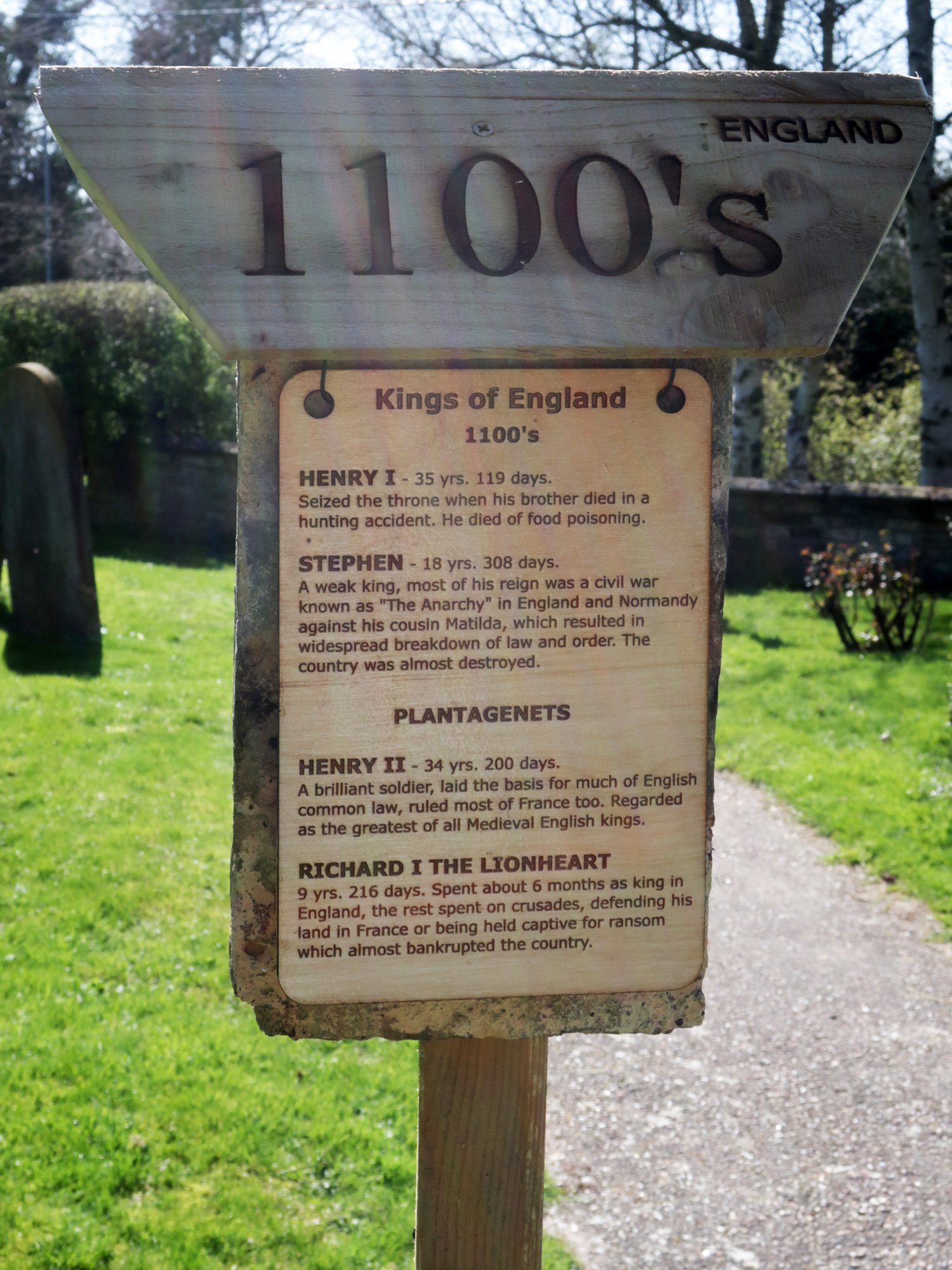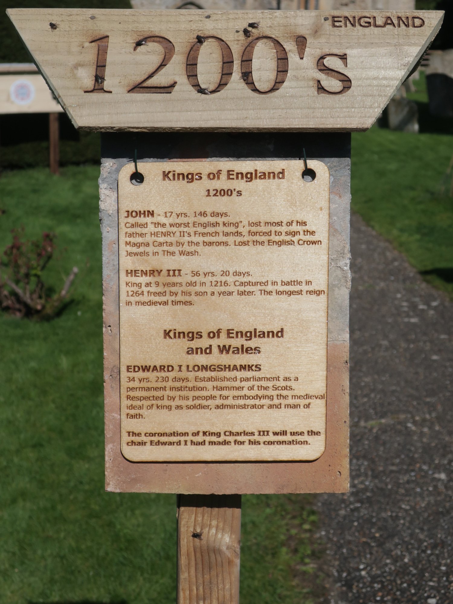 Each post is hung with two tiles as a background that came from the chancel roof during a 2019 restoration. The coloured stripes on the post represent the colours of the national flag at the time, yellow and blue for Mercia, red and white for England, red, white and blue for the United Kingdom.