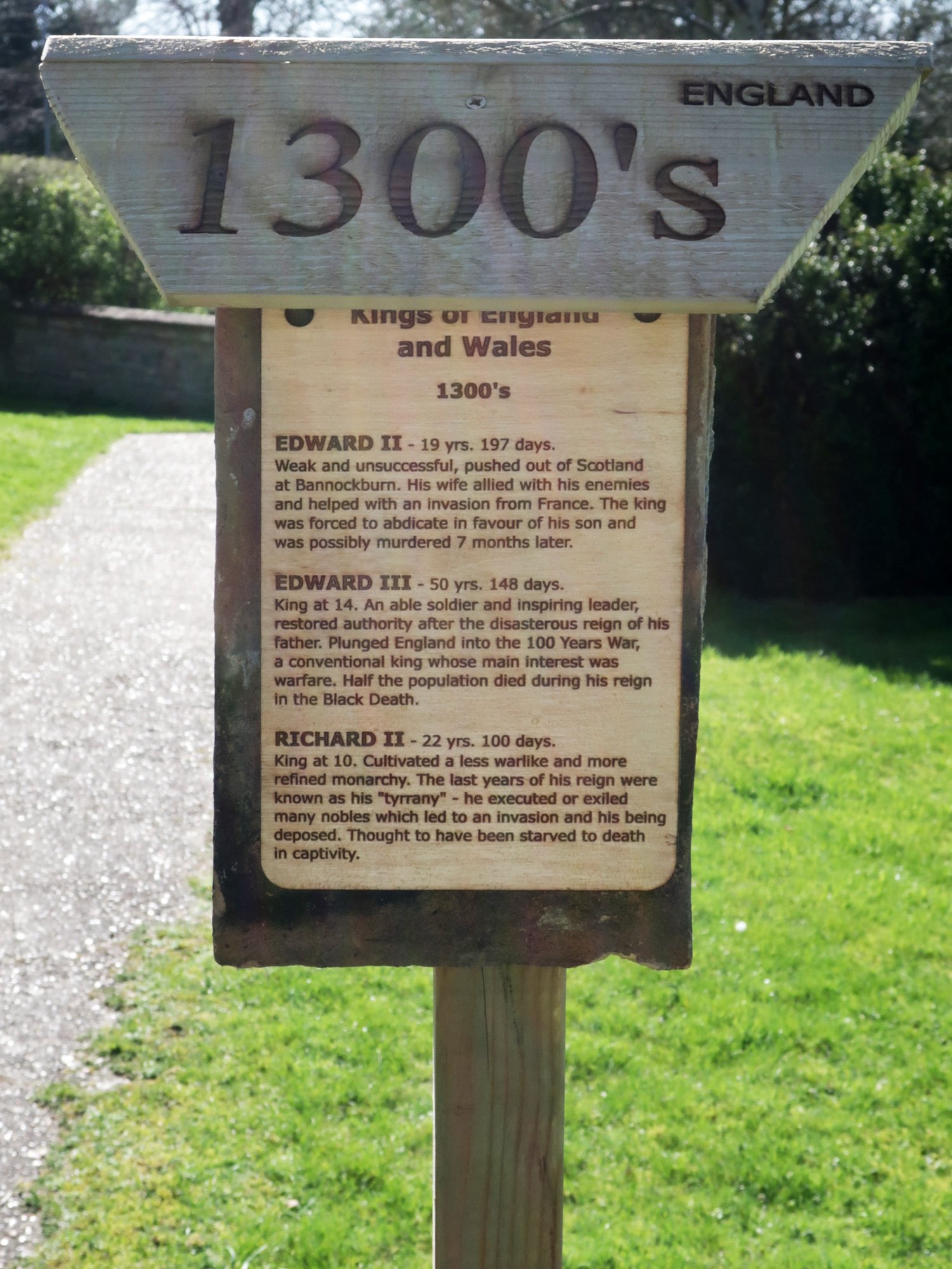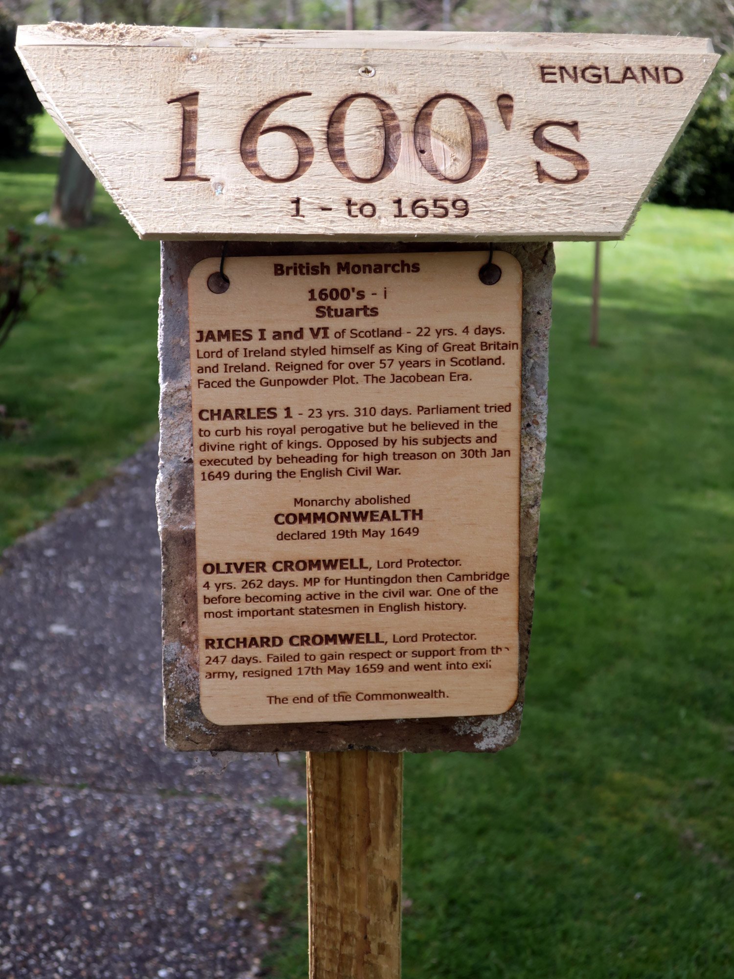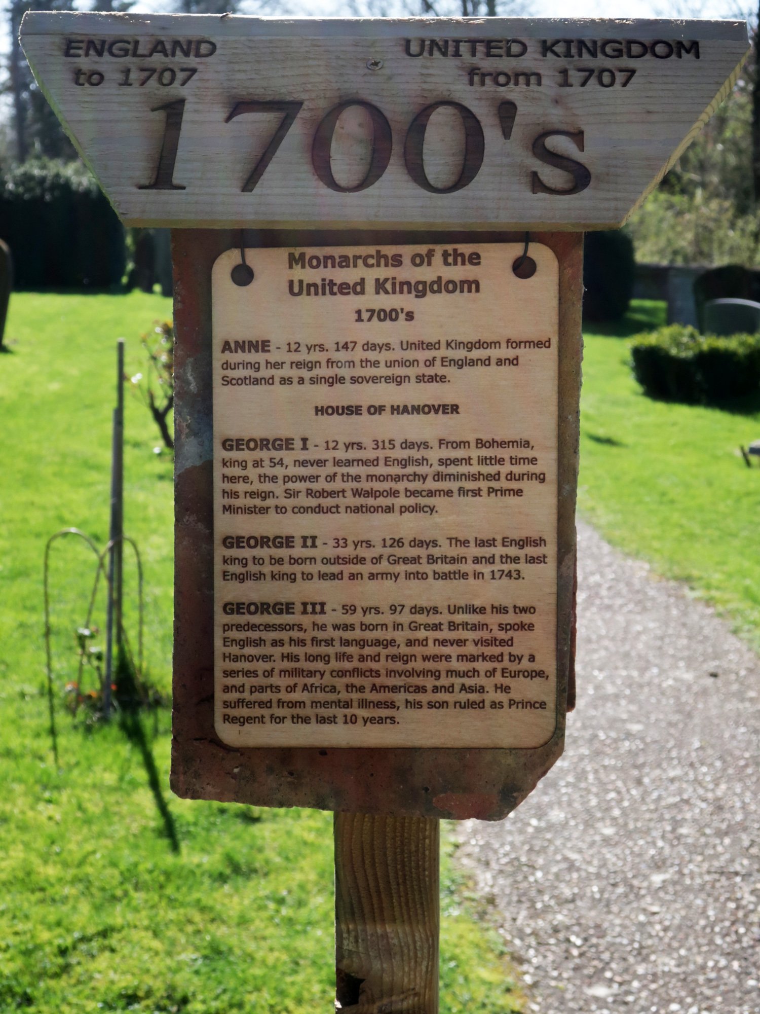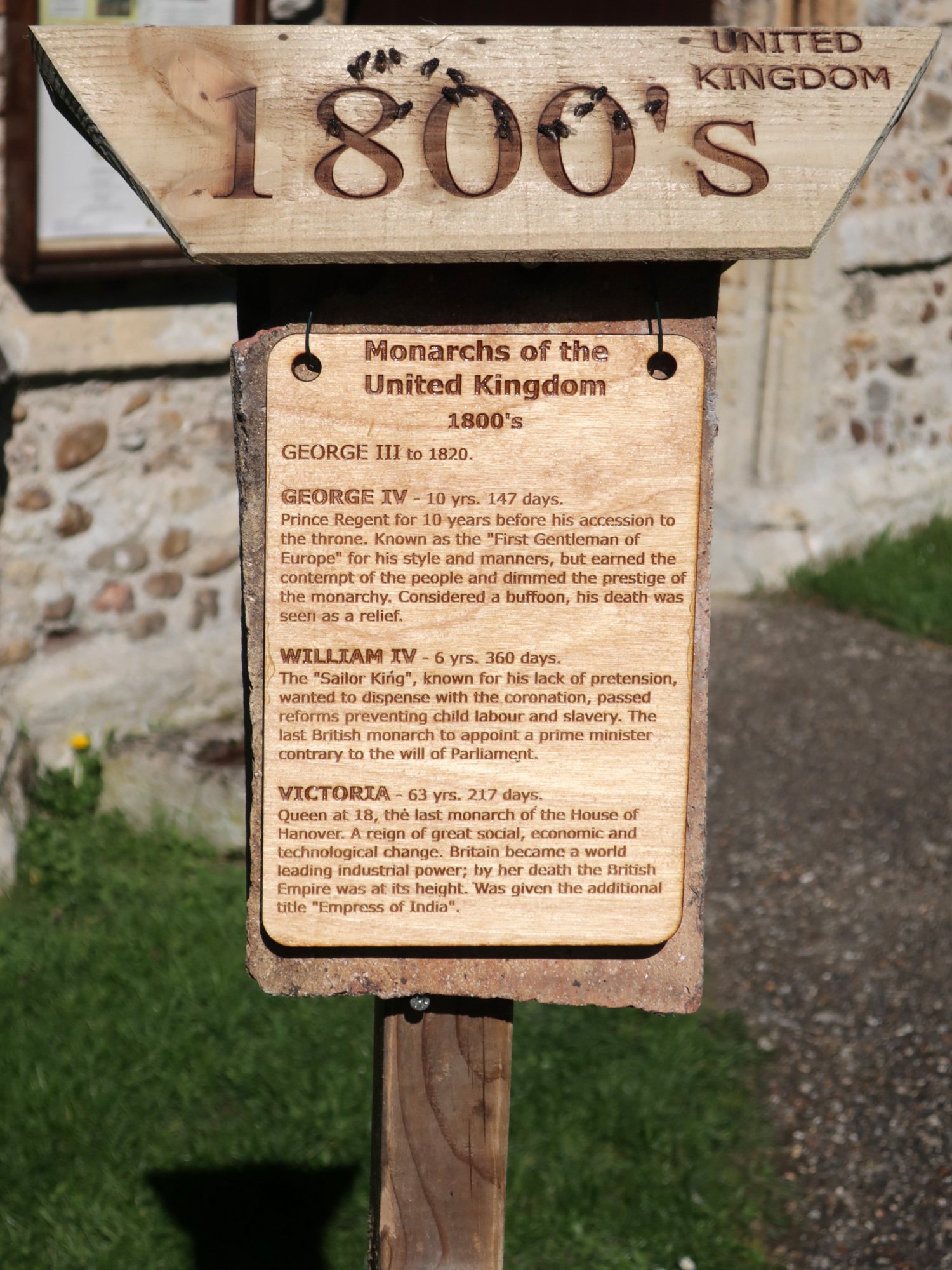 Each post is hung with two tiles as a background that came from the chancel roof during a 2019 restoration. The coloured stripes on the post represent the colours of the national flag at the time, yellow and blue for Mercia, red and white for England, red, white and blue for the United Kingdom.