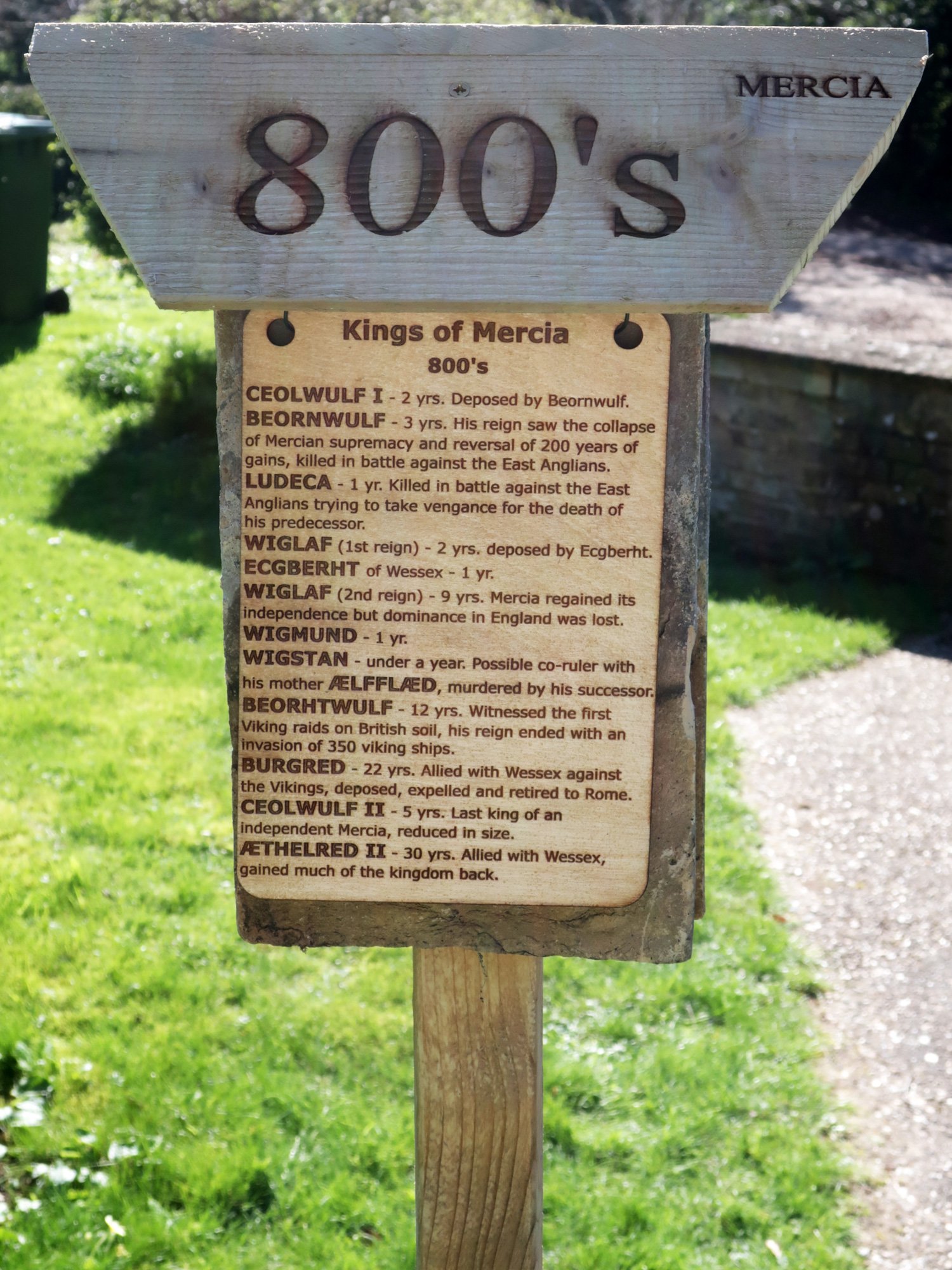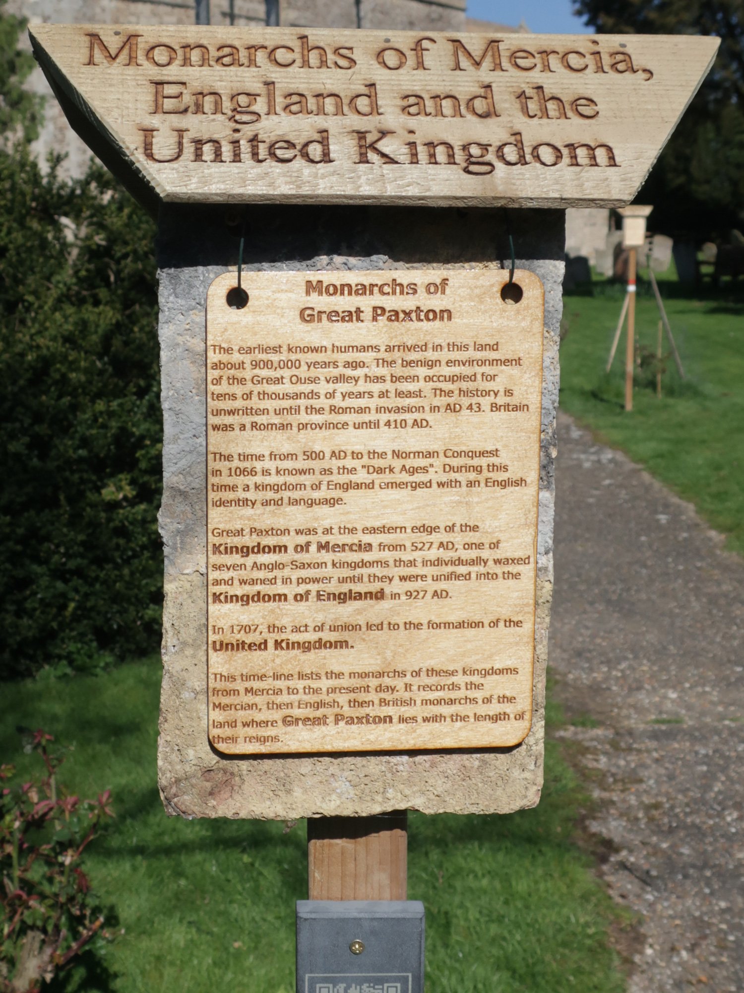This time-line lists the monarchs of these kingdoms from Mercia to the present day. It records the Mercian, then English, then British monarchs of the land where Great Paxton lies with the length of their reigns.