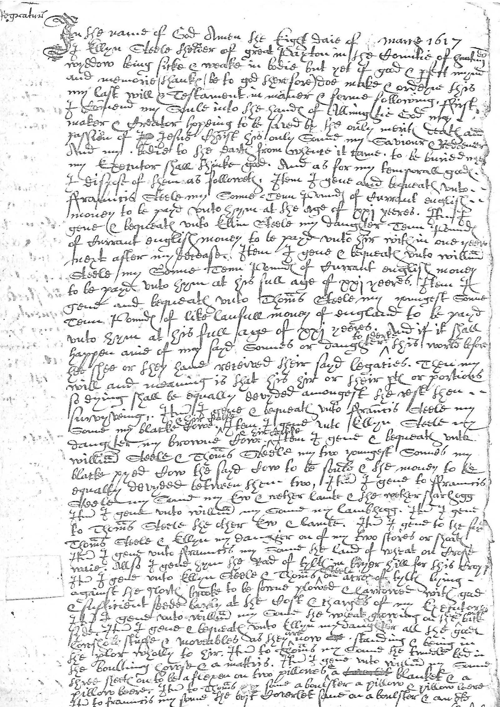The eighth day of March 1617 I Ellyn Steele the elder of Great Paxton in the county of Huntingdon widdow being sicke and weake in bodie but yet of good and perfect mynde and memorie (thanks be to God therefore) doe make and ordayne this my last will and testament in manner and form following.