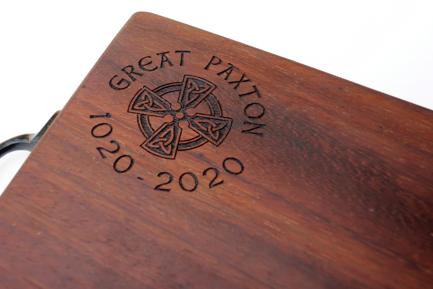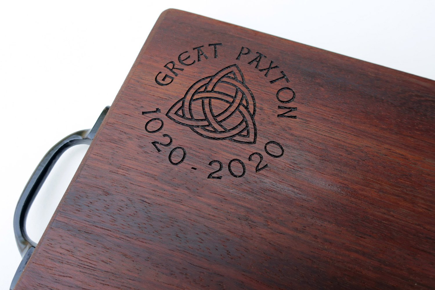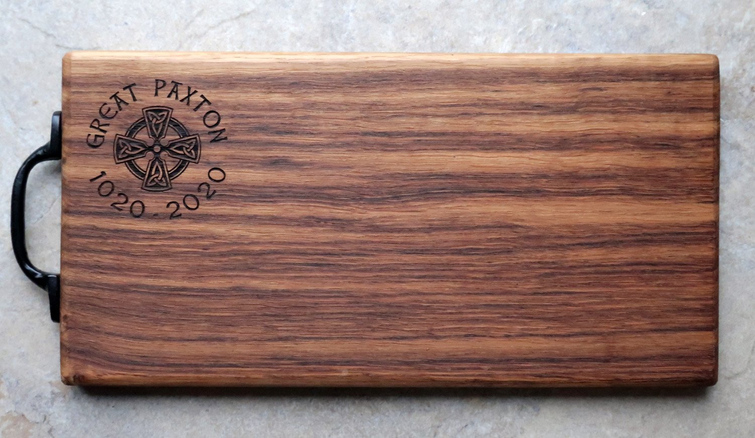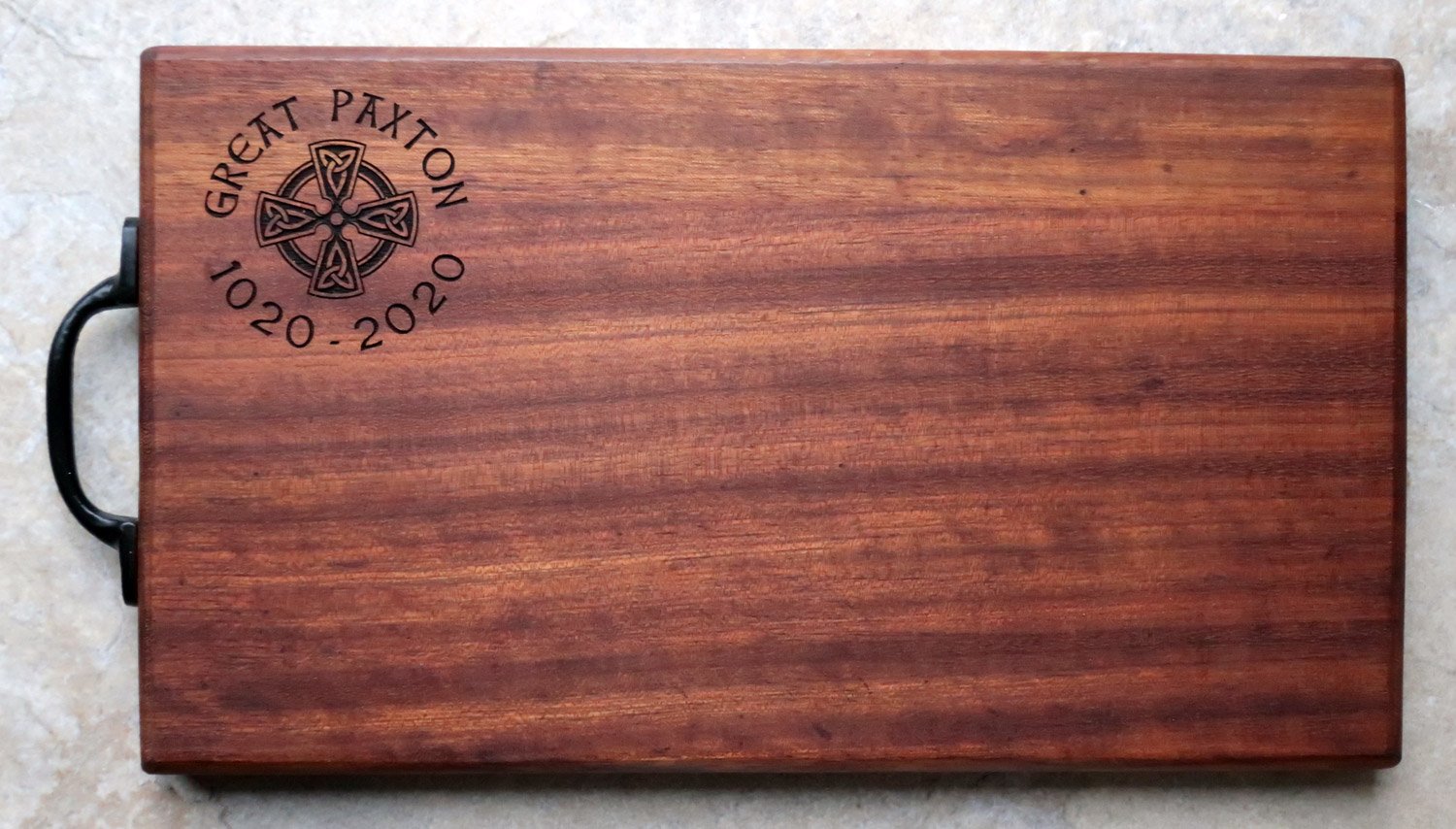 Repurposed tropical hardwood makes for a premium surface, we have used boards like this daily for over eight years and they are still going strong. Finished with a black antique iron handle and a coat of food-safe mineral oil.
