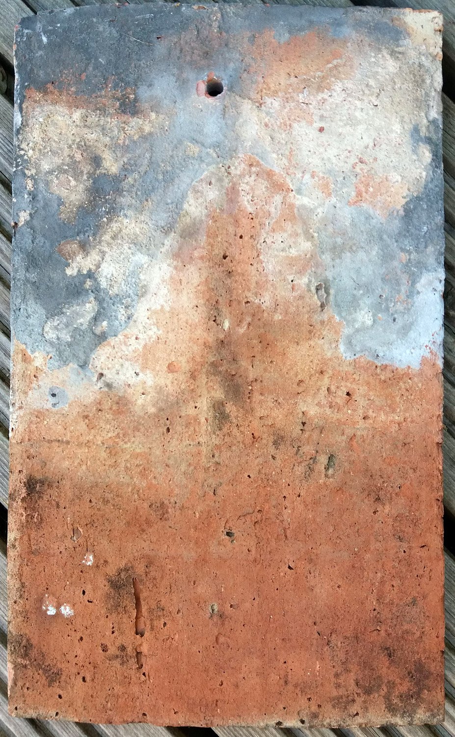 The railway arrived at Great Paxton (actually the Offords, it never stopped here) in about 1850 bringing with it amongst other things, mass produced roof tiles from clay and brick works around London. Prior to this nearly all tiles in the British Isles had been locally made. The red tiles are more uniform in size and shape though vary in tone, the two-hole ones are probably the oldest, up to 170 years, there are many bubbles and inclusions in the clay.