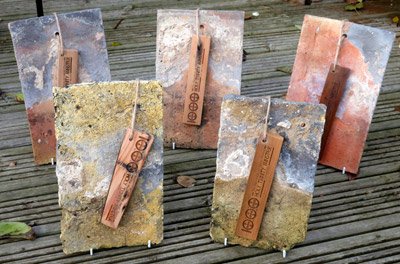Salvaged from the chancel roof during re-tiling, part of the very fabric of the church for many years protecting it from the elements. These have been cleaned to remove the grime of decades and are decorative items in their own right. Some may be hundreds of years old clearly having been hand made, possibly / probably at the brick works at the edge of the village (near where Ibbetts is) active from the Middle Ages to the late 1800's.